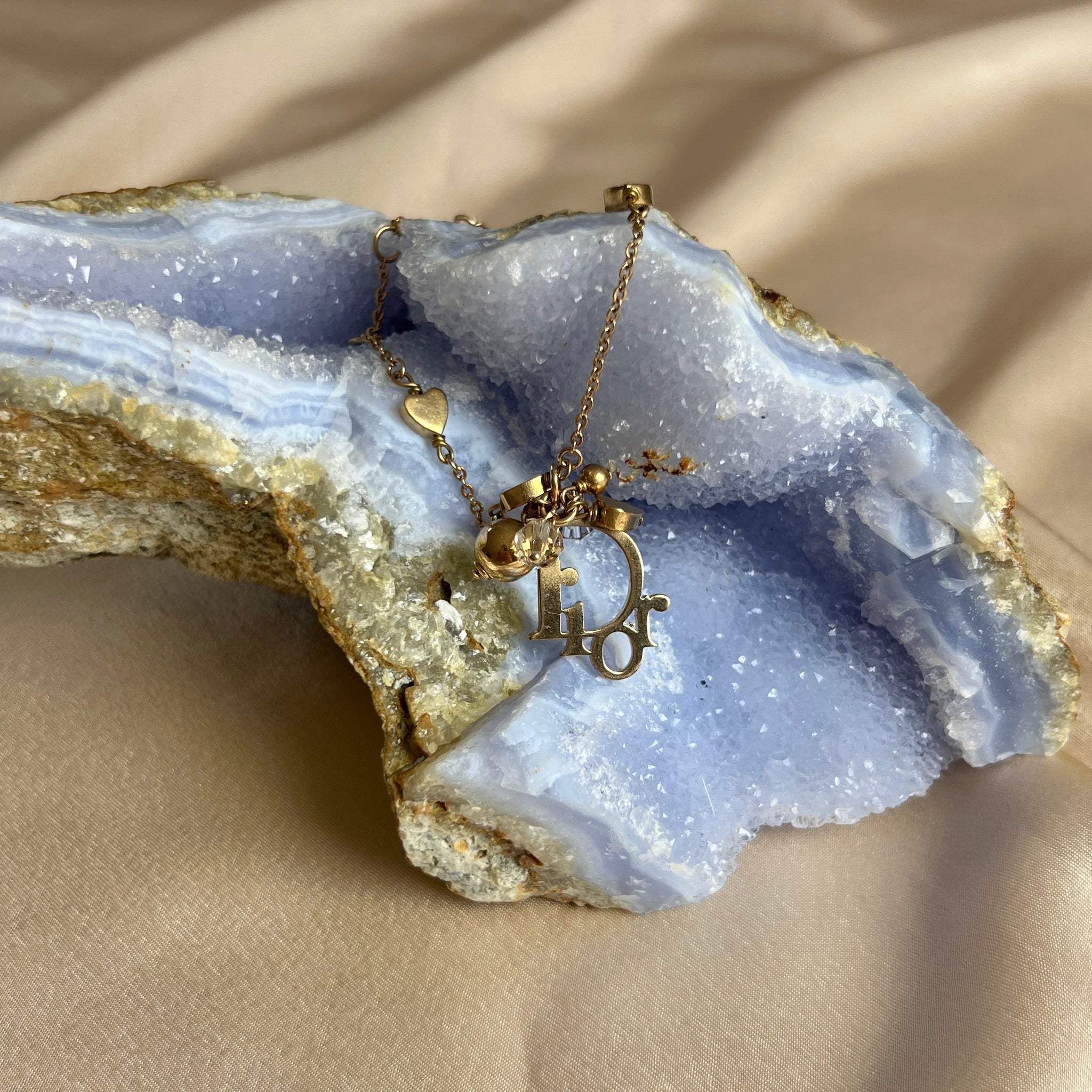 The gold-tone chain is detailed with repeating heart motifs and designed to be worn either alone or layered, capturing the playful, logo-forward spirit of Y2K Dior jewellery.