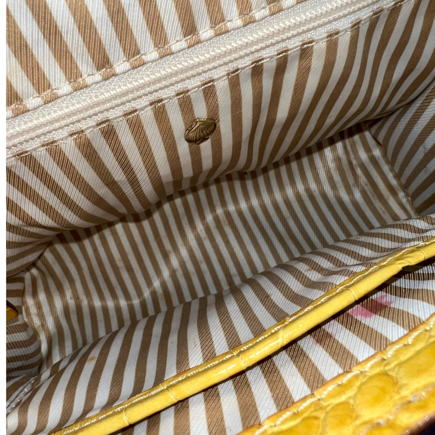 Inside, it’s lined in Kate Spade’s signature striped fabric, with light interior marks as shown. Overall, it’s in lovely vintage condition — bright, structured, and full of personality.