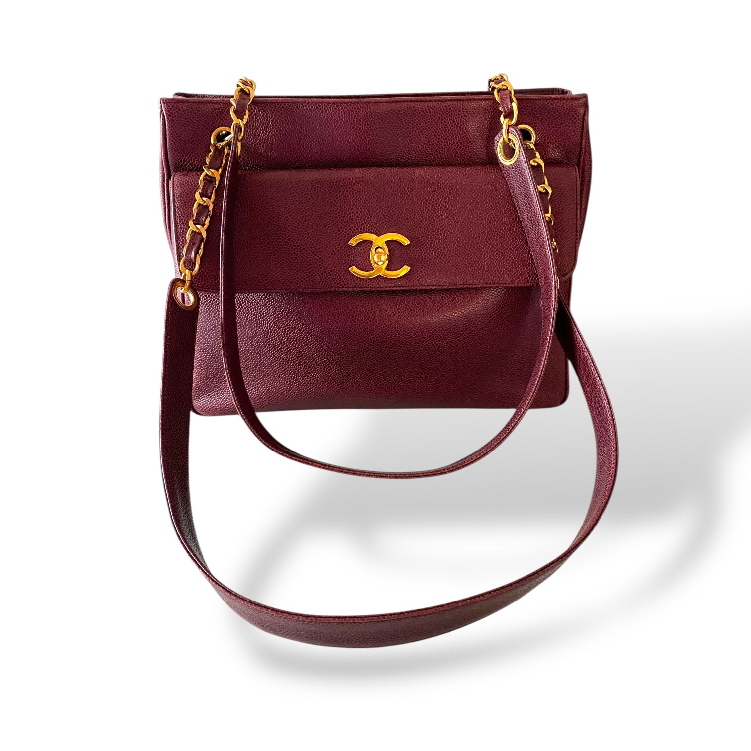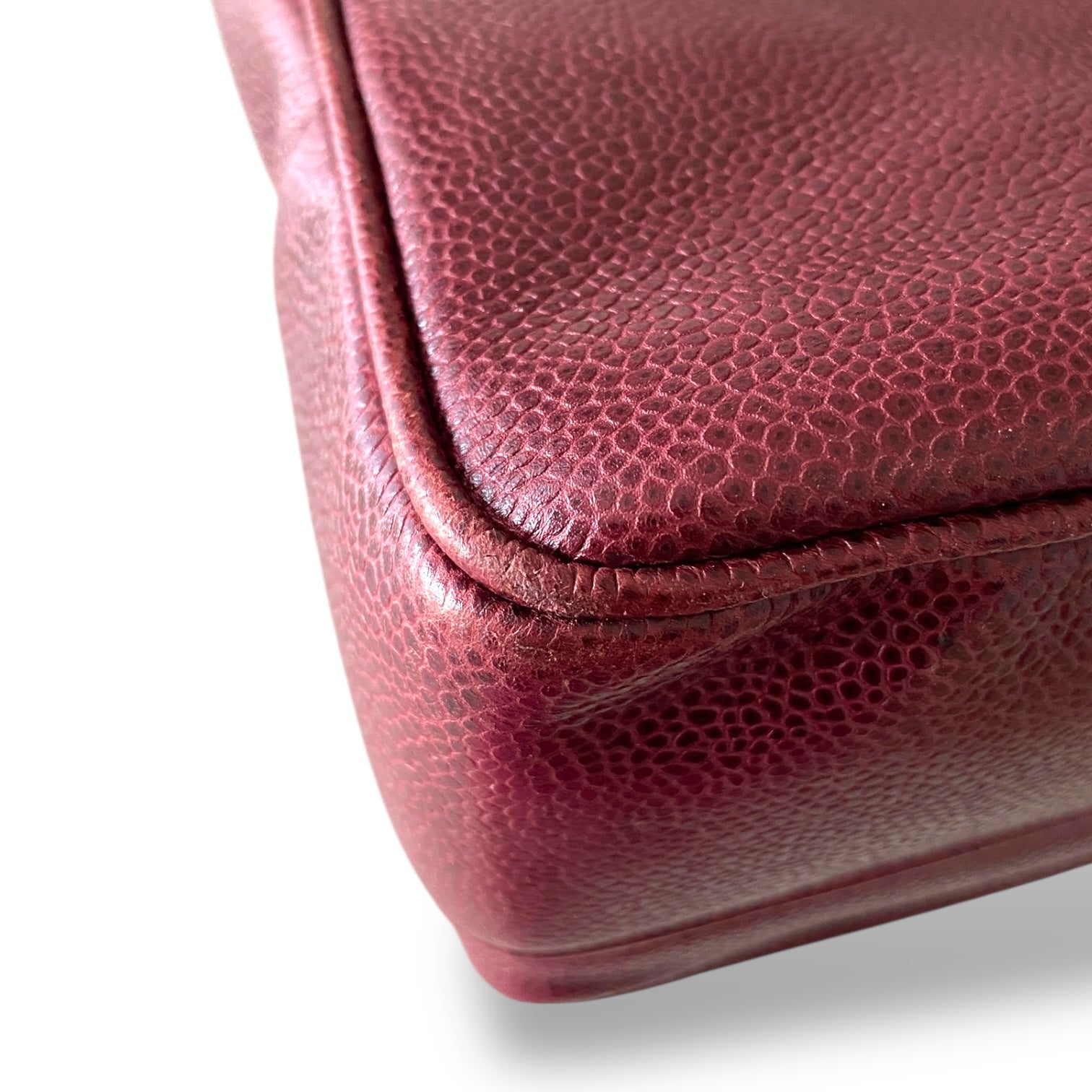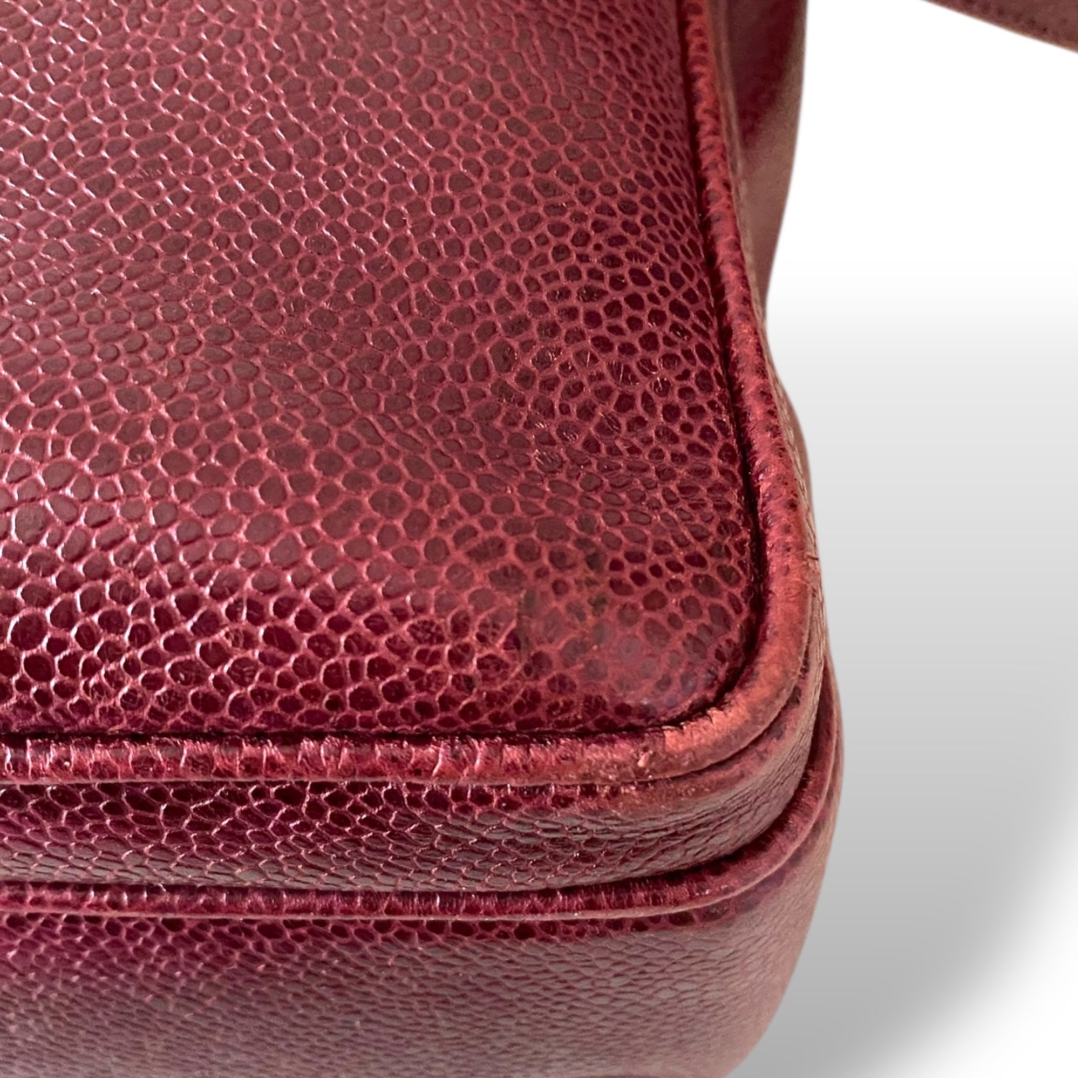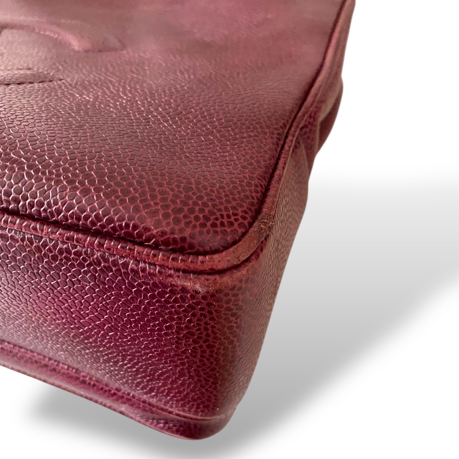 This beautiful vintage Chanel shoulder bag is fabricated from durable caviar leather in a rich deep burgundy / wine tone — a classic Chanel colour that sits somewhere between oxblood and Bordeaux. The textured caviar leather has a subtle sheen and a structured feel, making it both elegant and incredibly wearable.