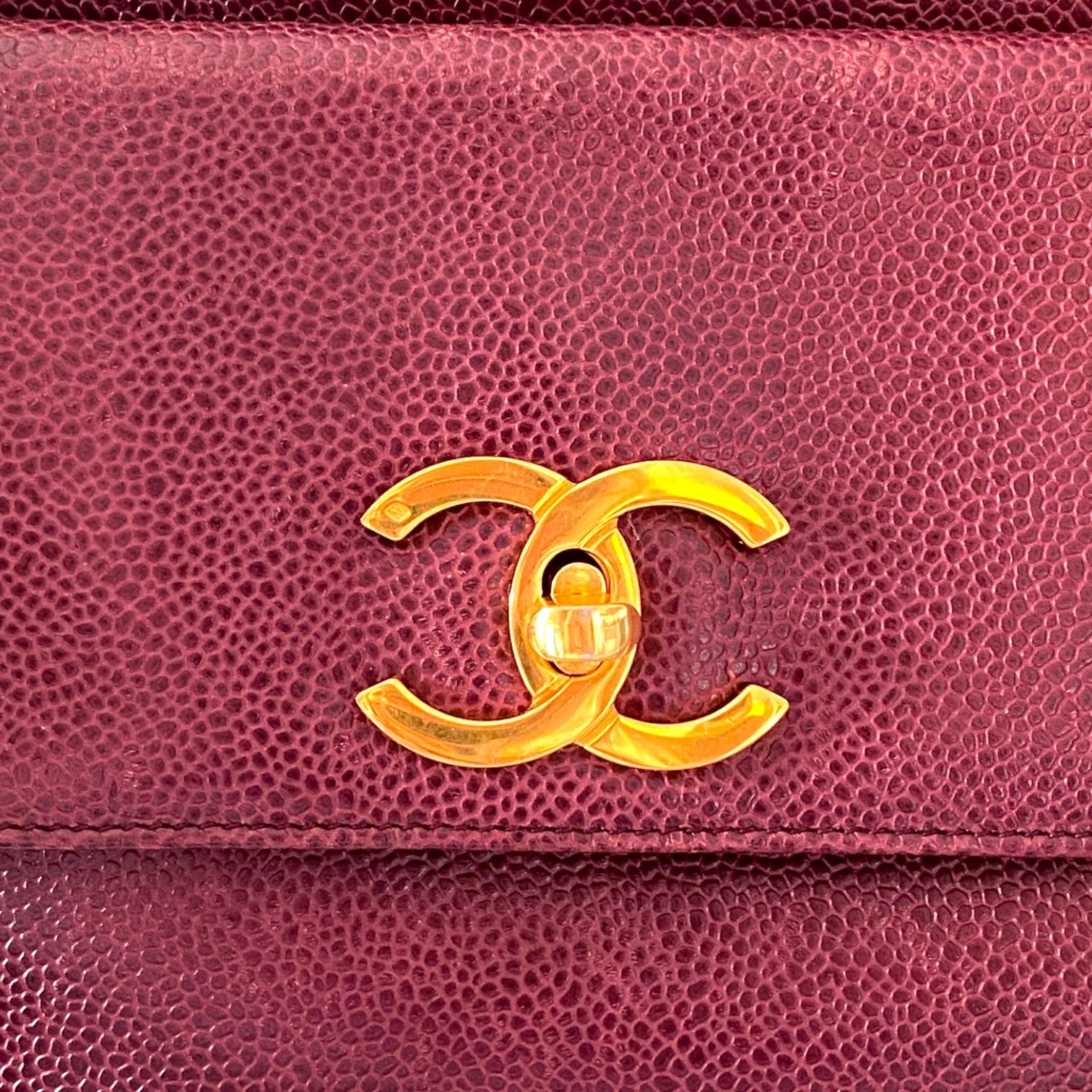 The bag features 24 ct gold-plated hardware, including the interlocking CC turn-lock and chain-and-leather shoulder strap. The warmth of the gold contrasts beautifully with the depth of the burgundy leather, giving the bag that unmistakable early-90s Chanel presence — polished, confident, and timeless.