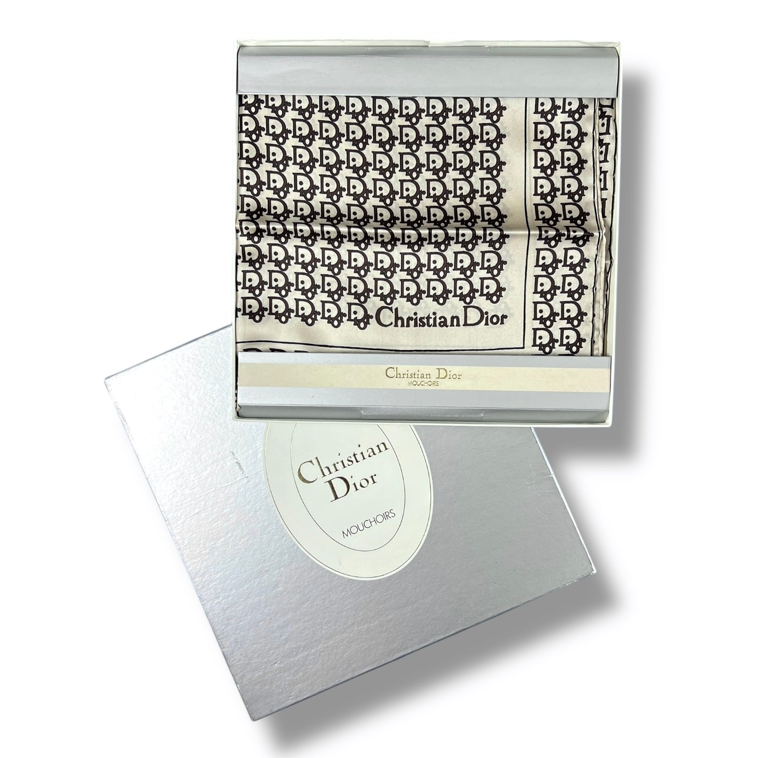 The scarf is clearly labelled “Christian Dior” on the front, allowing the branding to be worn visibly when styled — a detail that elevates both wearability and collectibility. It remains unused and beautifully preserved, with crisp edges and strong contrast, and is housed in its original silver Dior presentation box marked Christian Dior Mouchiors, which significantly enhances its appeal.