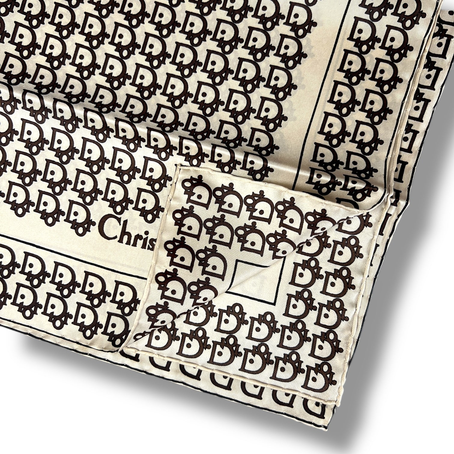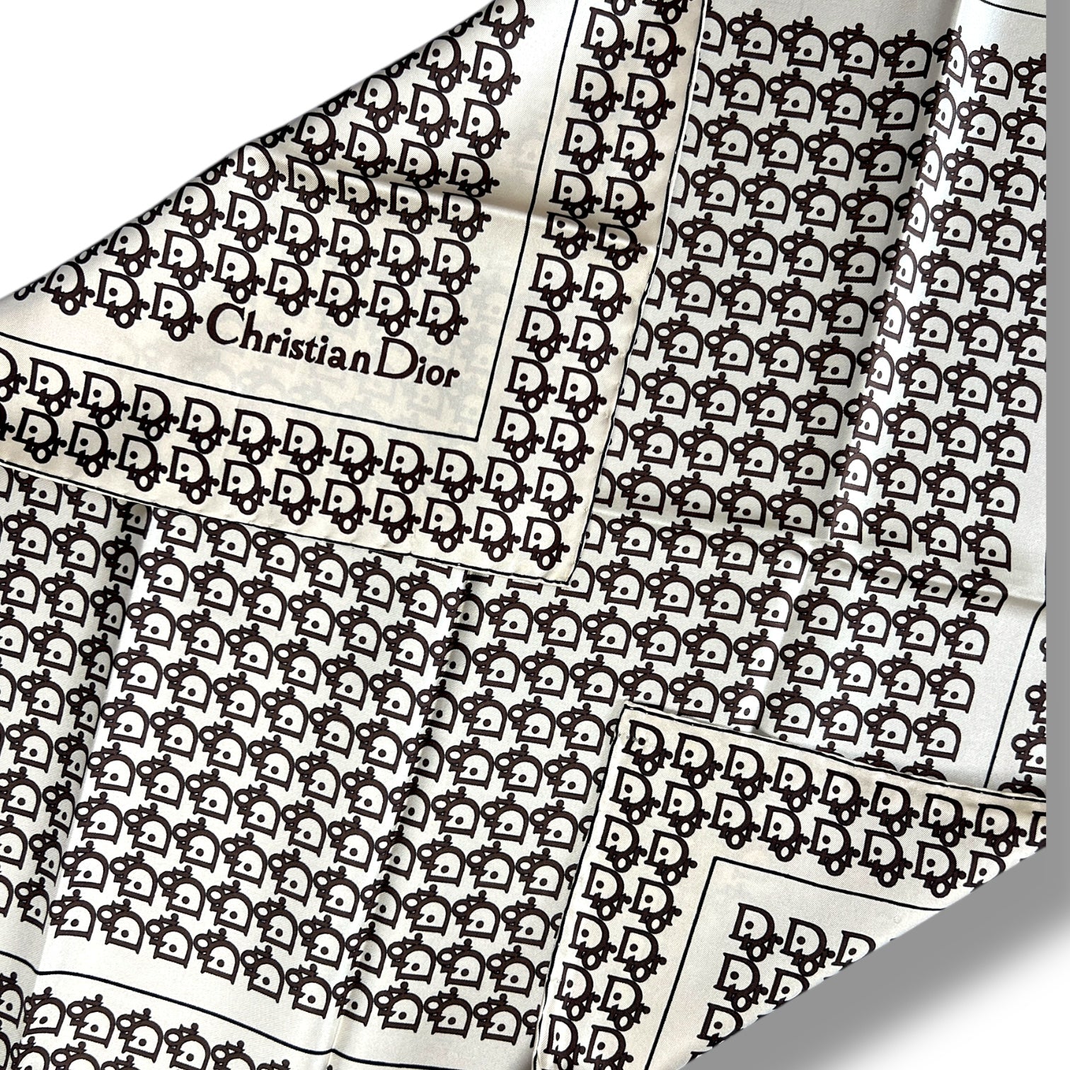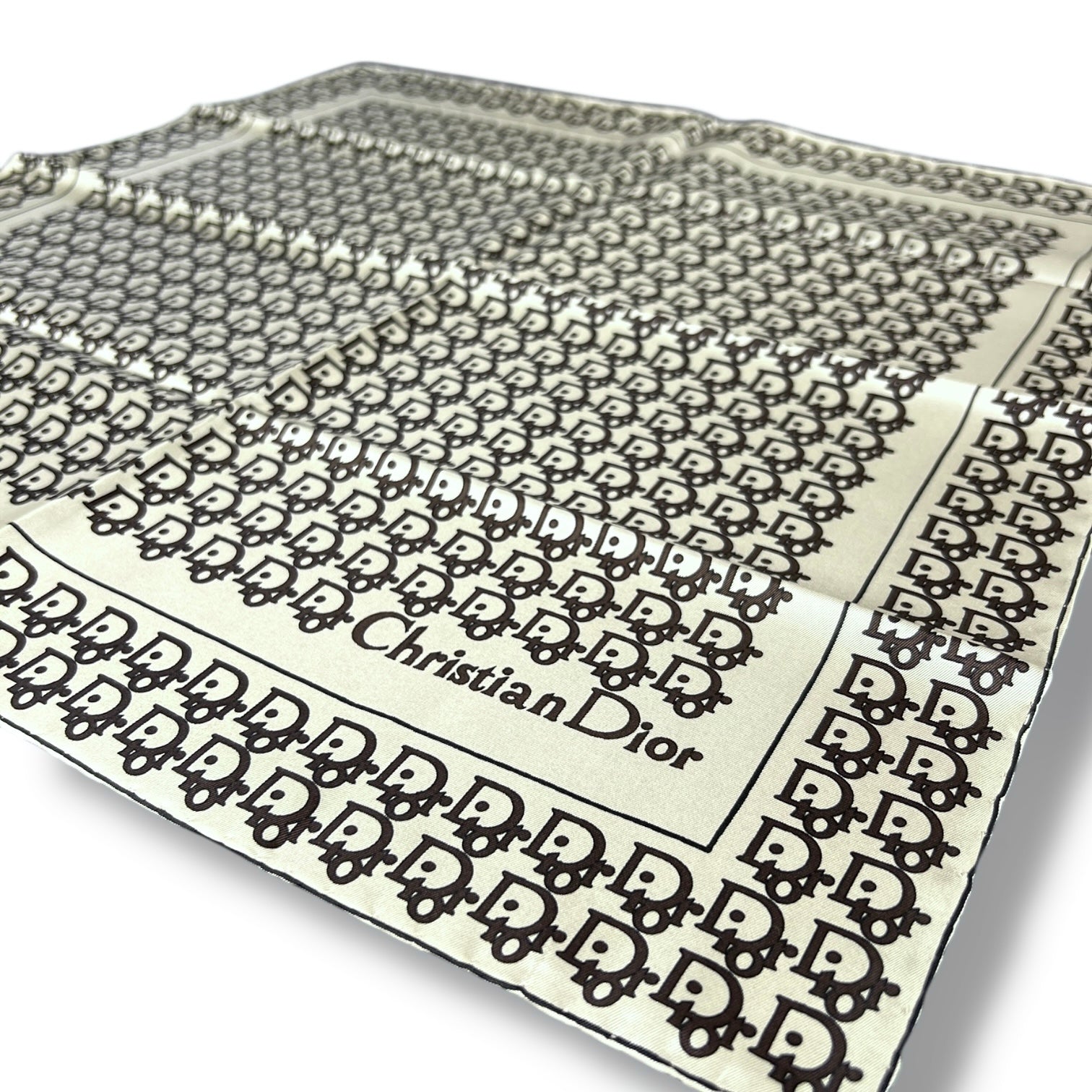 A stunning vintage Christian Dior silk scarf, presented in its original Dior Mouchiors box — a true collector’s piece and increasingly hard to find in this condition. The scarf features Dior’s iconic all-over monogram in black on an ivory ground, framed with a classic border that feels timeless, elegant, and unmistakably Dior.