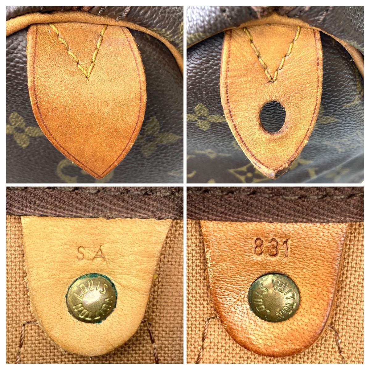 The date code SA831 indicates a manufacture date of March 1981 in France. It has domed rivets and no interior pocket—hallmarks of early Speedy construction.