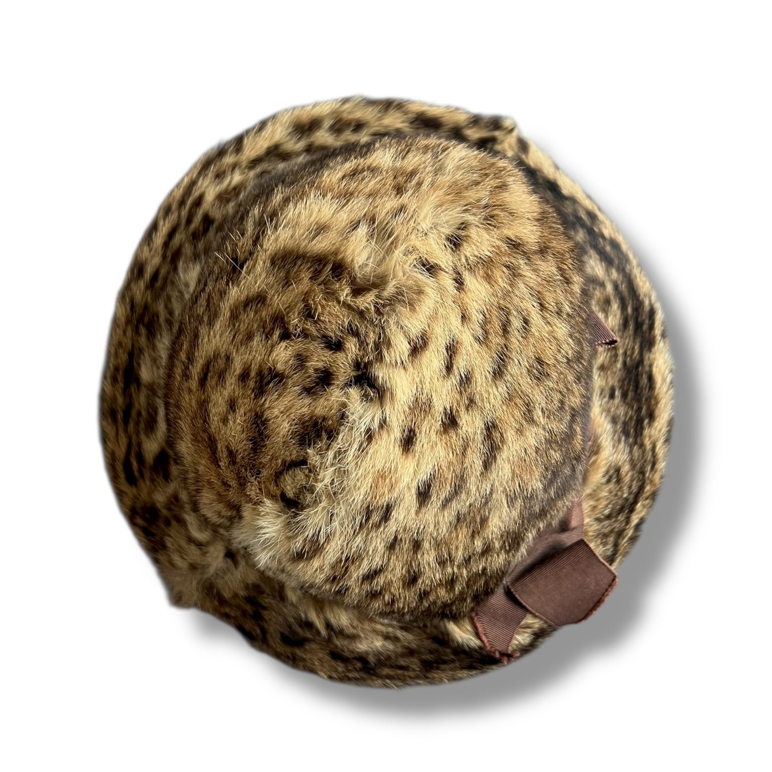 This exquisite vintage hat is a statement in old-world elegance. Made by Bigel of Bruxelles—a boutique Belgian milliner known for their luxurious mid-century creations—this piece features beautifully patterned fur in warm, natural tones, likely from ocelot or another exotic cat, backed with a rich brown grosgrain ribbon and matching bow detail.