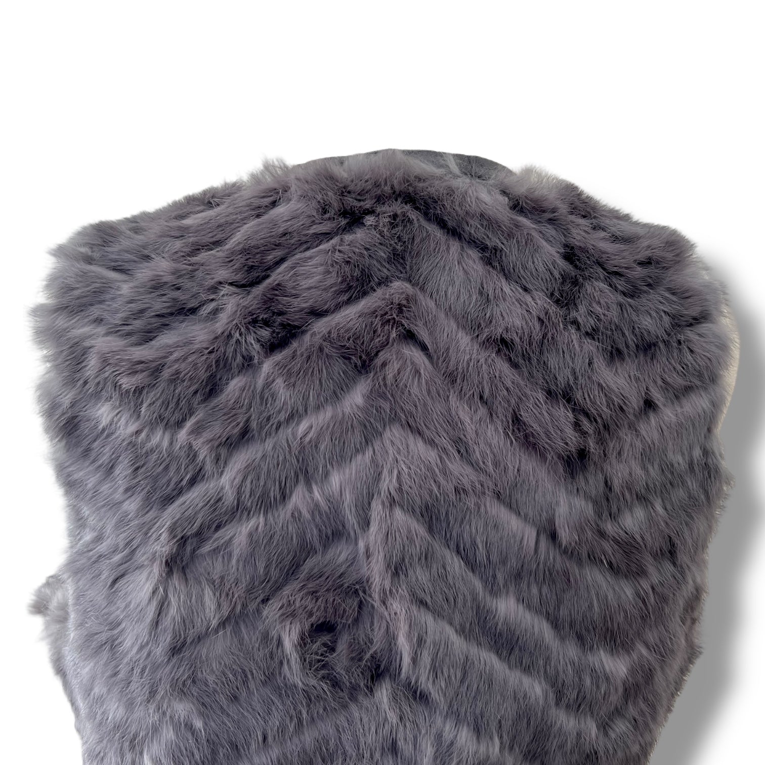 A dream in soft grey rabbit fur with a lush chevron texture and beautiful natural sheen. This piece is fully lined and closes with hidden hooks at the front. The silhouette is clean and modern, making it perfect over a knit or under a heavier coat when layering. A luxurious neutral that works with everything—jeans, tailoring, or full-on drama.