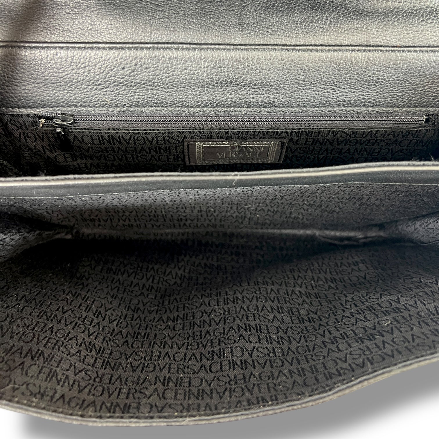 Opening the bag reveals a spacious, well-organised interior, lined in Versace’s signature logo jacquard fabric and clearly labelled Gianni Versace, confirming authenticity. The interior compartments make it practical as a briefcase or structured day bag, while the overall silhouette allows it to be styled far beyond traditional workwear — this is a piece that transitions seamlessly into fashion territory.