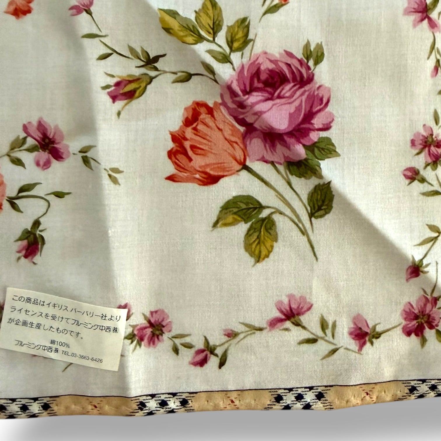 Soft, romantic, and quietly iconic. This vintage Burberry London scarf features a delicate rose print in blush, coral, and soft green tones, framed with a subtle nod to the house’s signature check along the border.