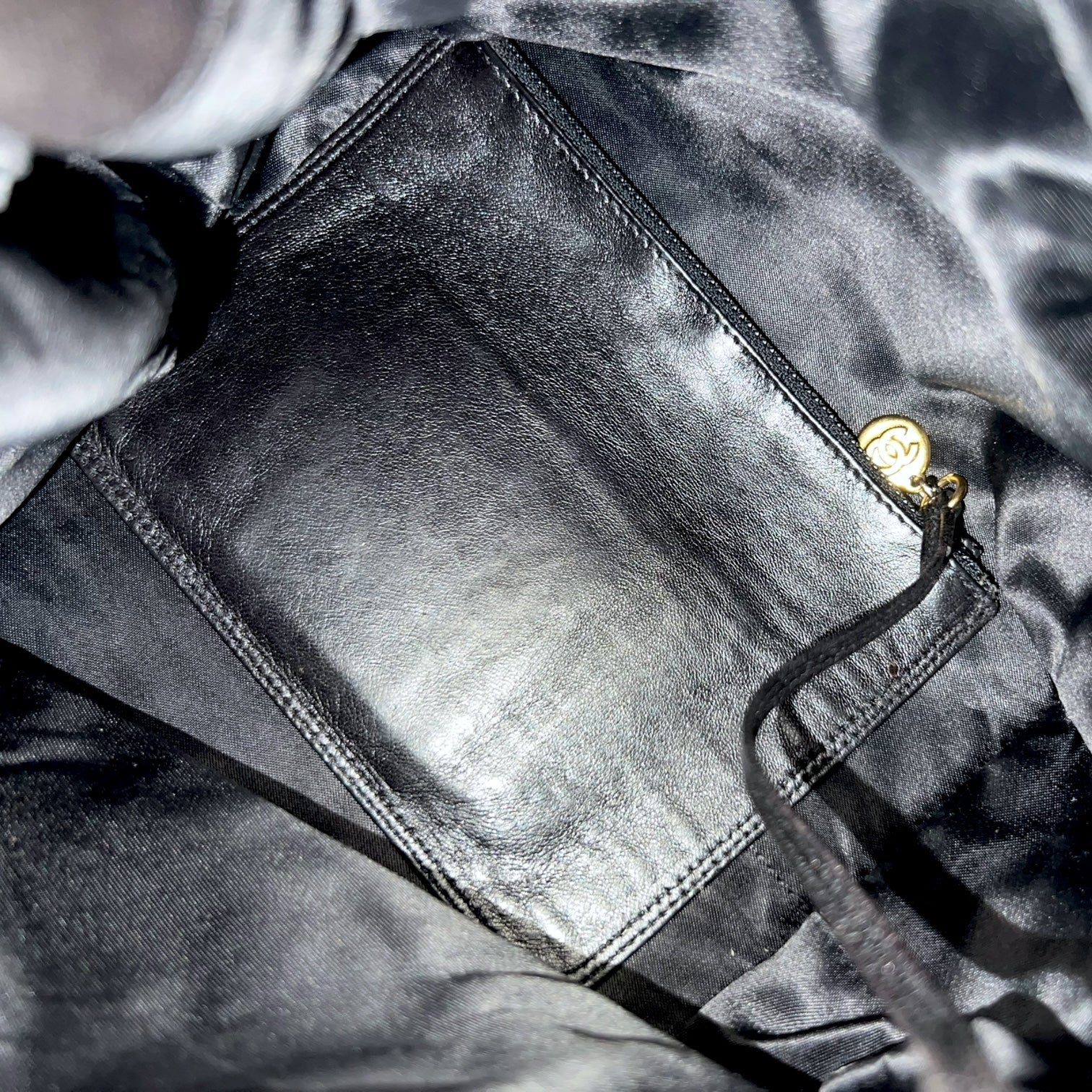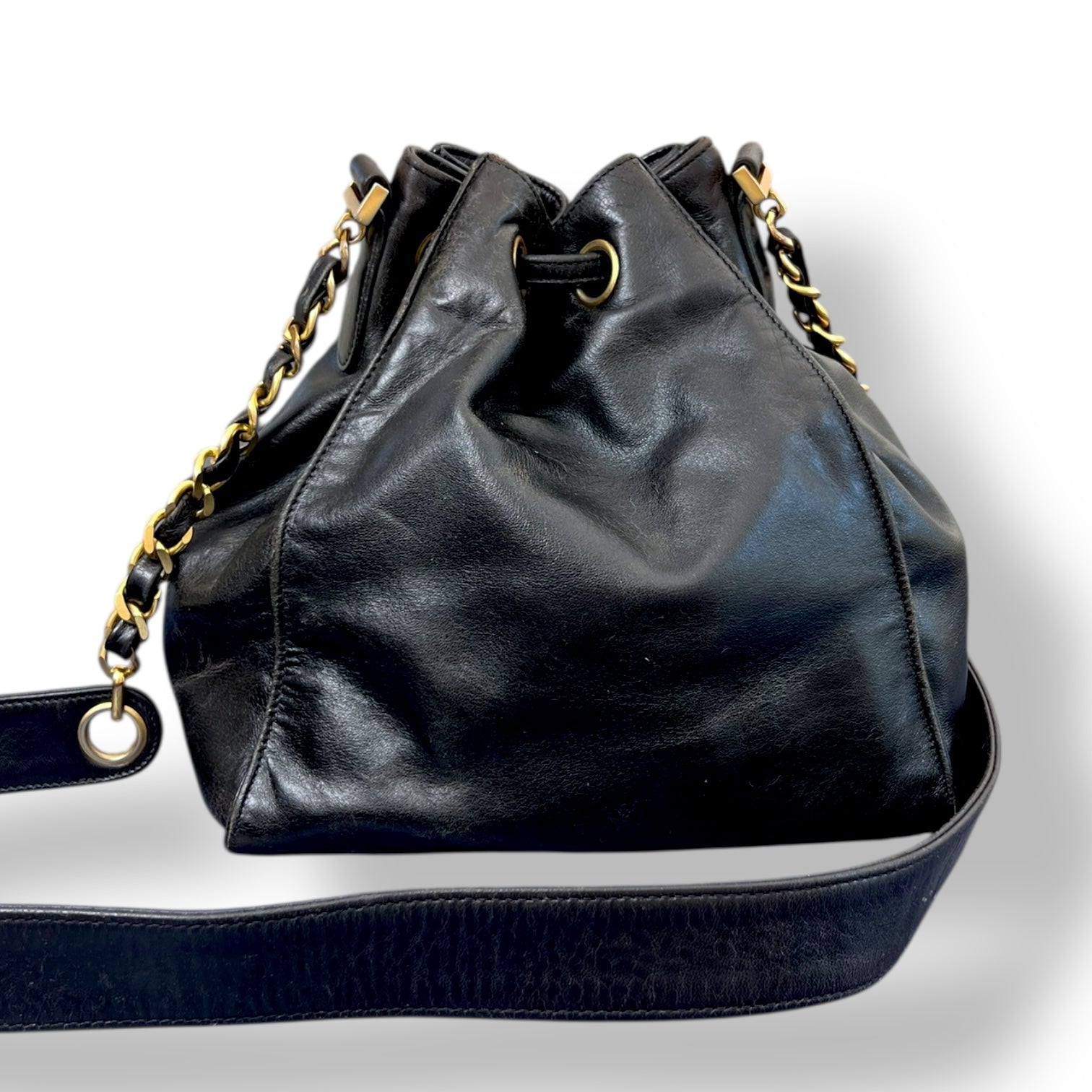 A stunning vintage Chanel black lambskin drawstring bucket bag, dating from 1994–1996 — one of the most coveted production eras known for its 24k gold-plated hardware and exceptional quality.