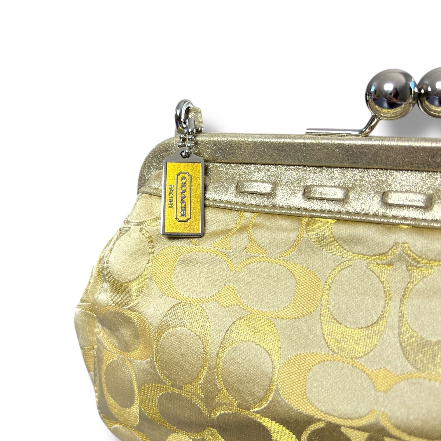 A beautifully nostalgic Coach signature jacquard shoulder bag in a soft champagne-gold palette, finished with a classic kiss-lock frame closure and subtle metallic leather trim. This style sits firmly in early-2000s Coach territory — elegant, feminine, and unapologetically polished, with just the right hint of Y2K glamour.
