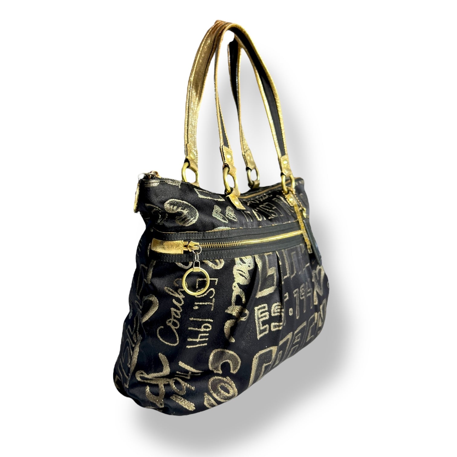 A bold icon from the Coach archives — this Poppy Glam Tote is pure Y2K energy with a luxe twist. The metallic gold graffiti-style logo print pops against black nylon, finished with gold handles, chunky zips, and the signature Coach tag charm.
