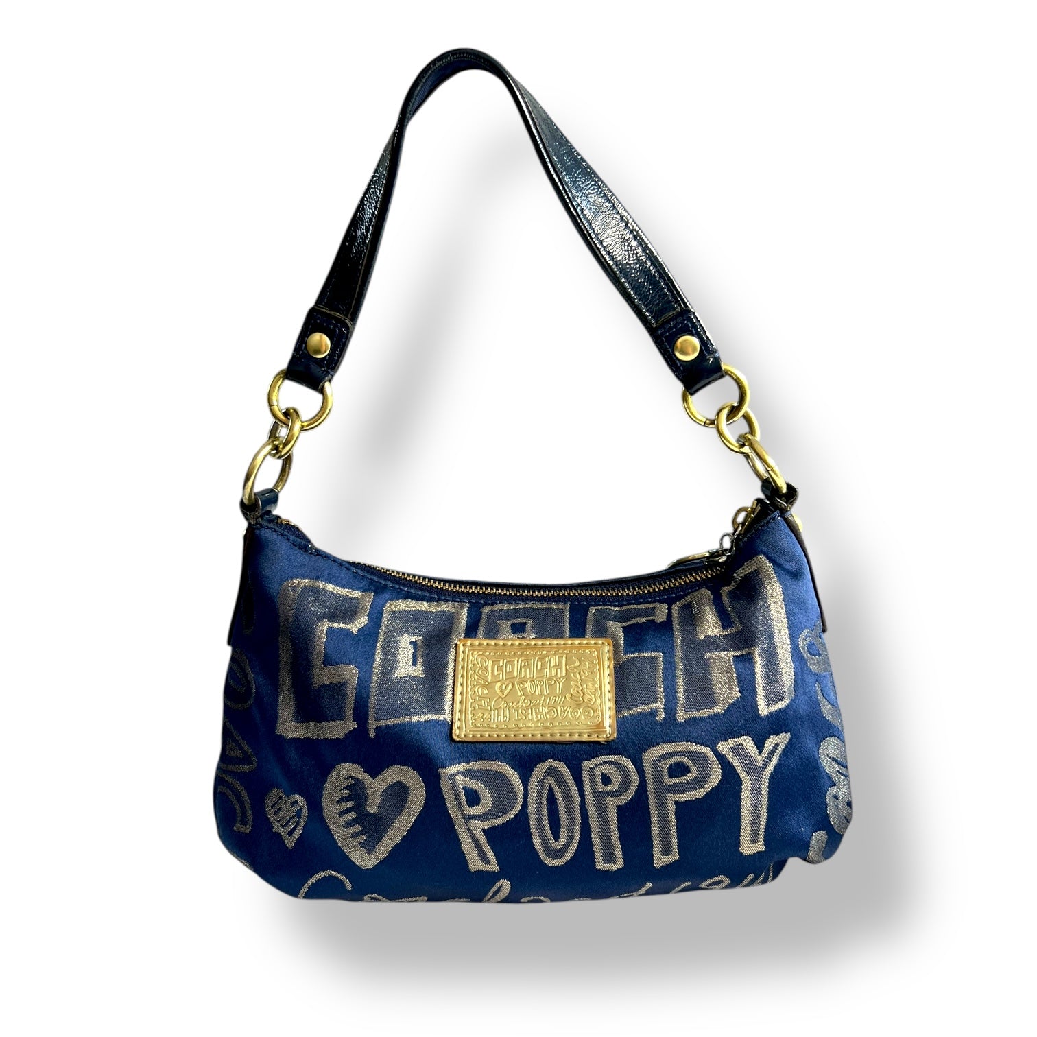 Crafted in shimmering metallic blue jacquard with silver Poppy graffiti lettering, this style features both a detachable crossbody strap and a short shoulder strap, plus bold gold-tone hardware and patent leather accents. The front flap pocket gives it that signature early-2010s Coach edge, while the roomy satin-lined interior adds a polished finish.