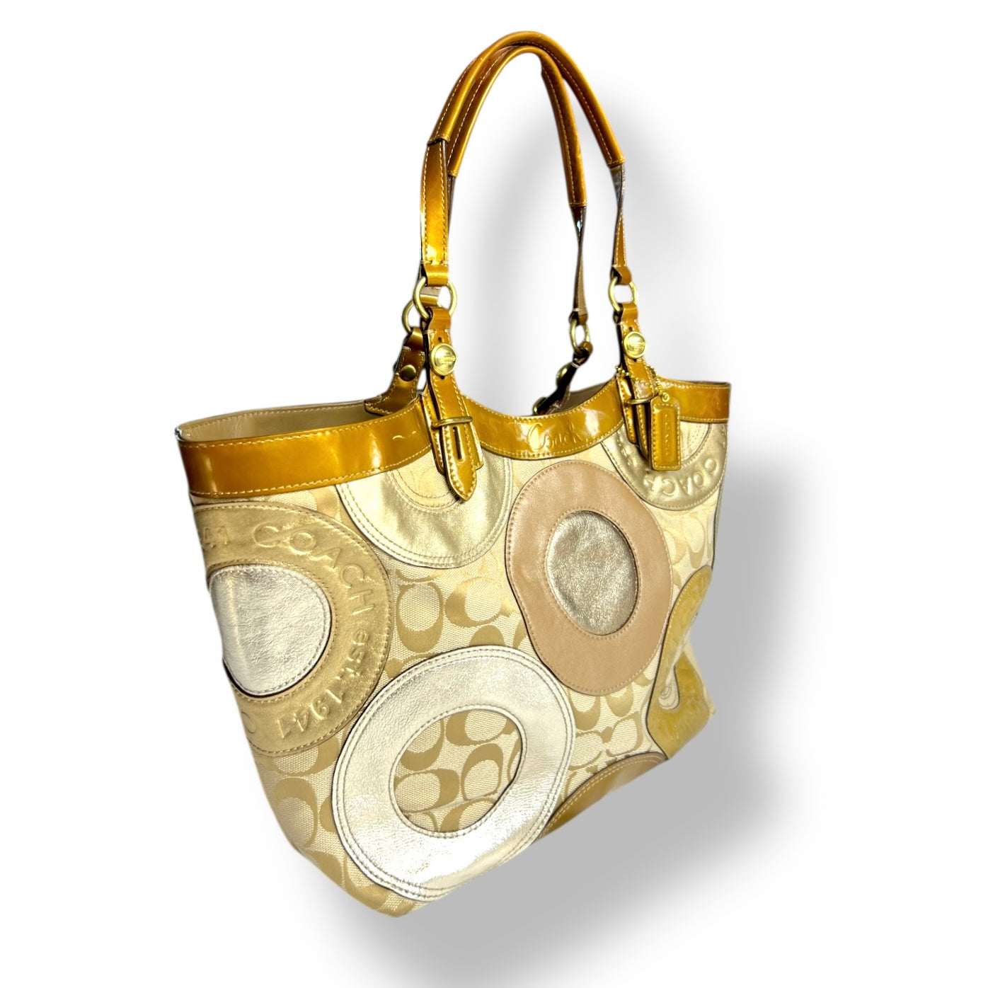 Bold, luminous, and unmistakably early 2010s — this Coach Poppy Metallic Signature Glam Tote is all about statement shine and playful sophistication.