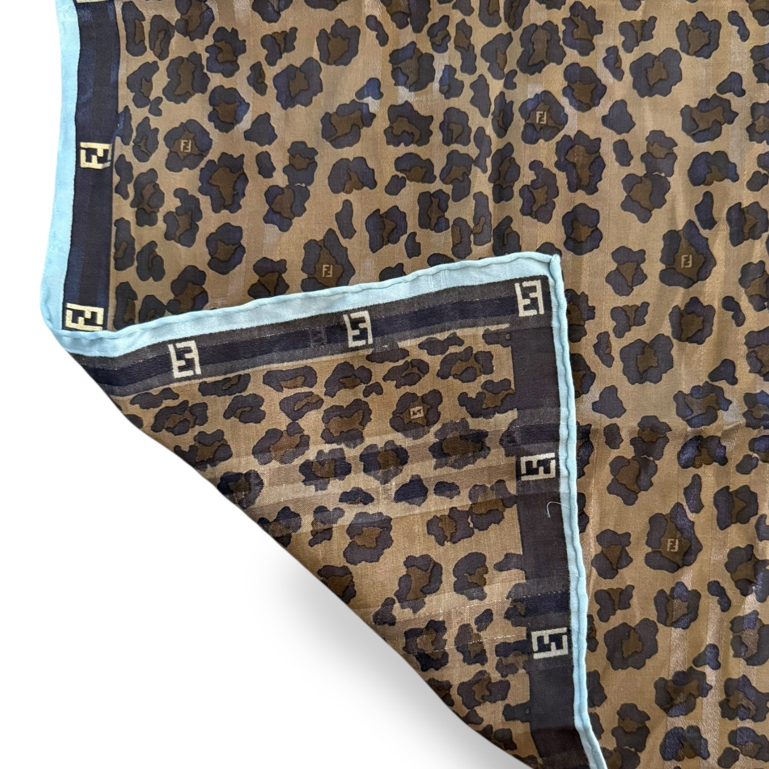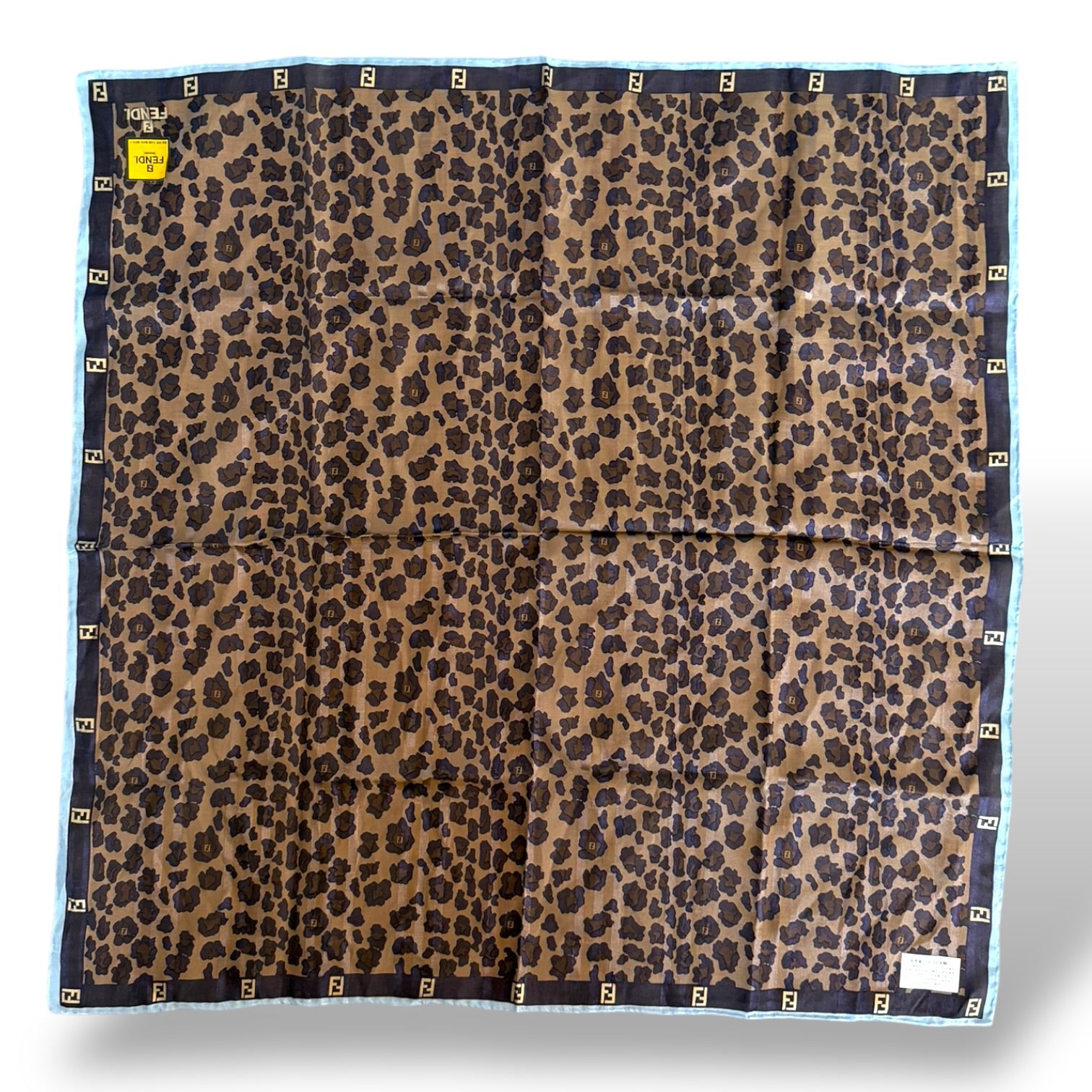 A seriously chic vintage Fendi moment. This square scarf features an all-over leopard print in warm caramel and deep espresso tones, framed with the iconic FF logo border and finished with a soft powder-blue edge that gives it just the right lift.