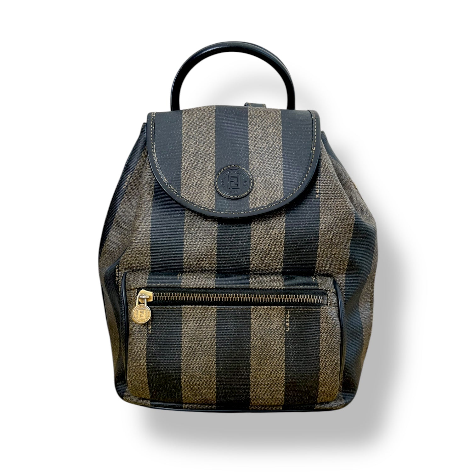 An icon of the late 1980s and 1990s, the Fendi Pequin line redefined Italian luxury with its instantly recognisable chocolate and black vertical stripes. This rare vintage backpack is beautifully structured in Fendi’s signature coated canvas trimmed with smooth black leather and finished with gold-tone hardware and logo zip pulls.