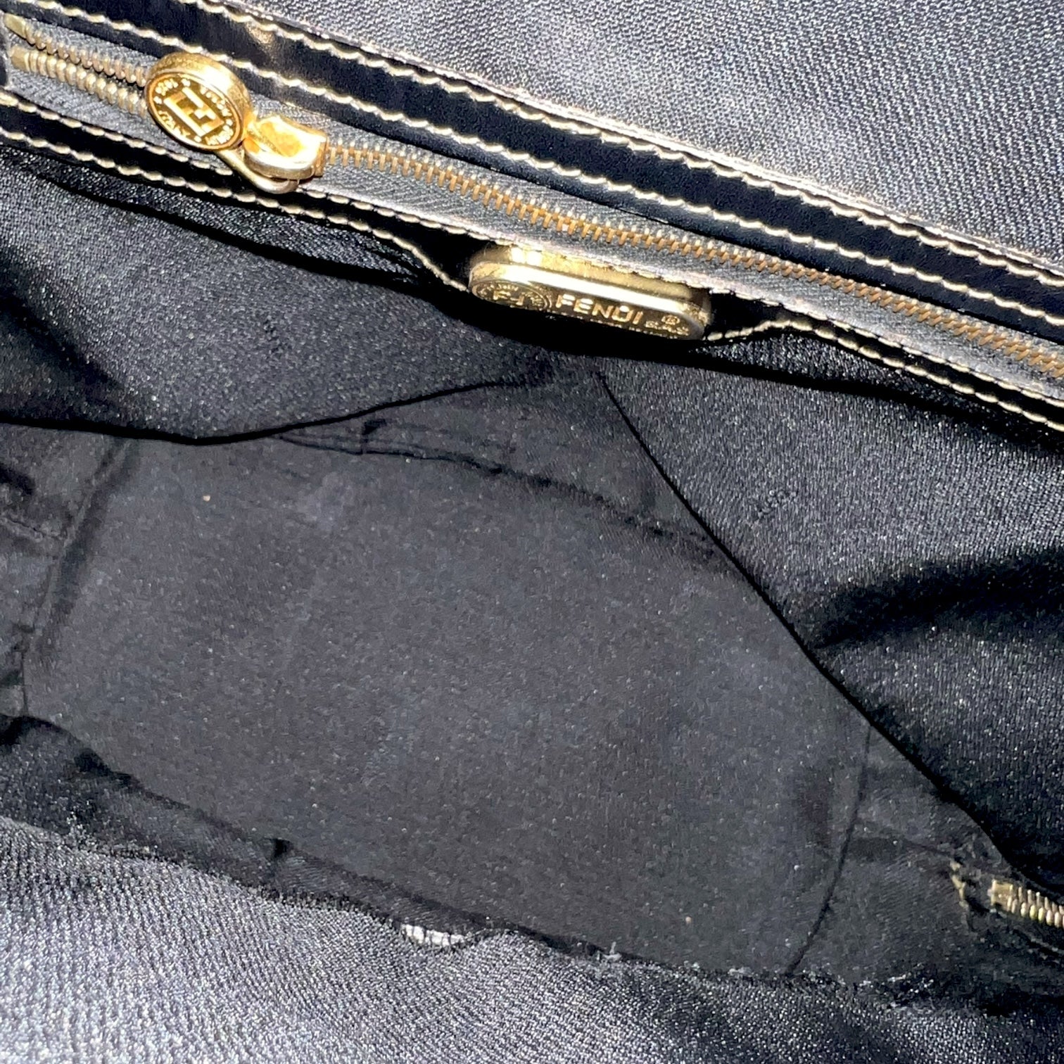 The top flap opens to a drawstring interior lined in black fabric with a zip pocket, while the adjustable leather straps and top handle make it as practical as it is chic. The canvas shows only light, even wear, and the leather remains in excellent condition — a beautifully preserved example of one of Fendi’s most timeless patterns.