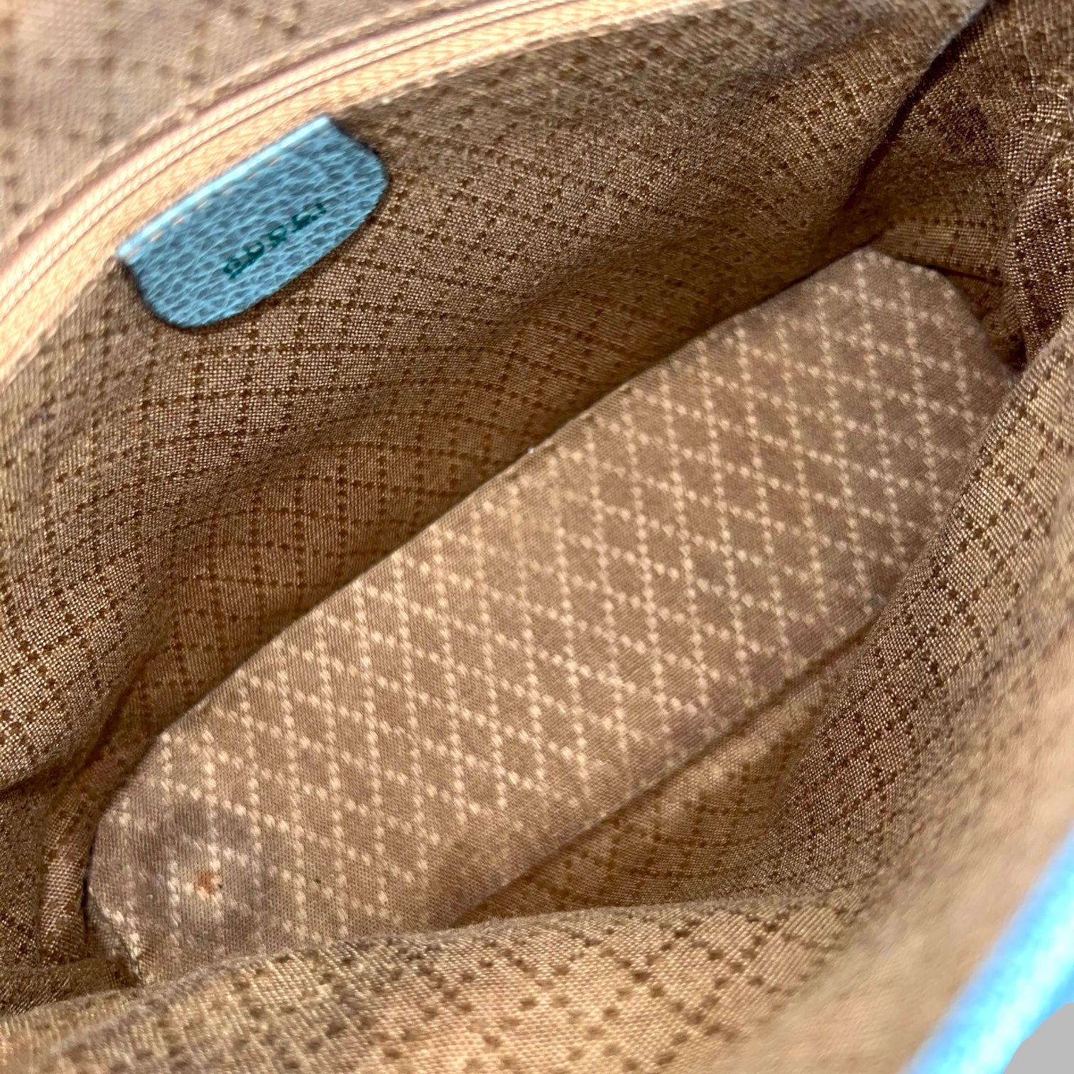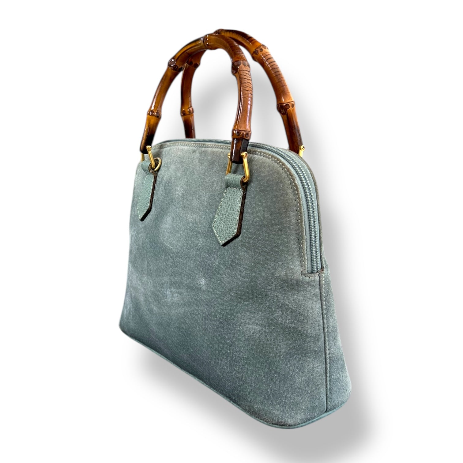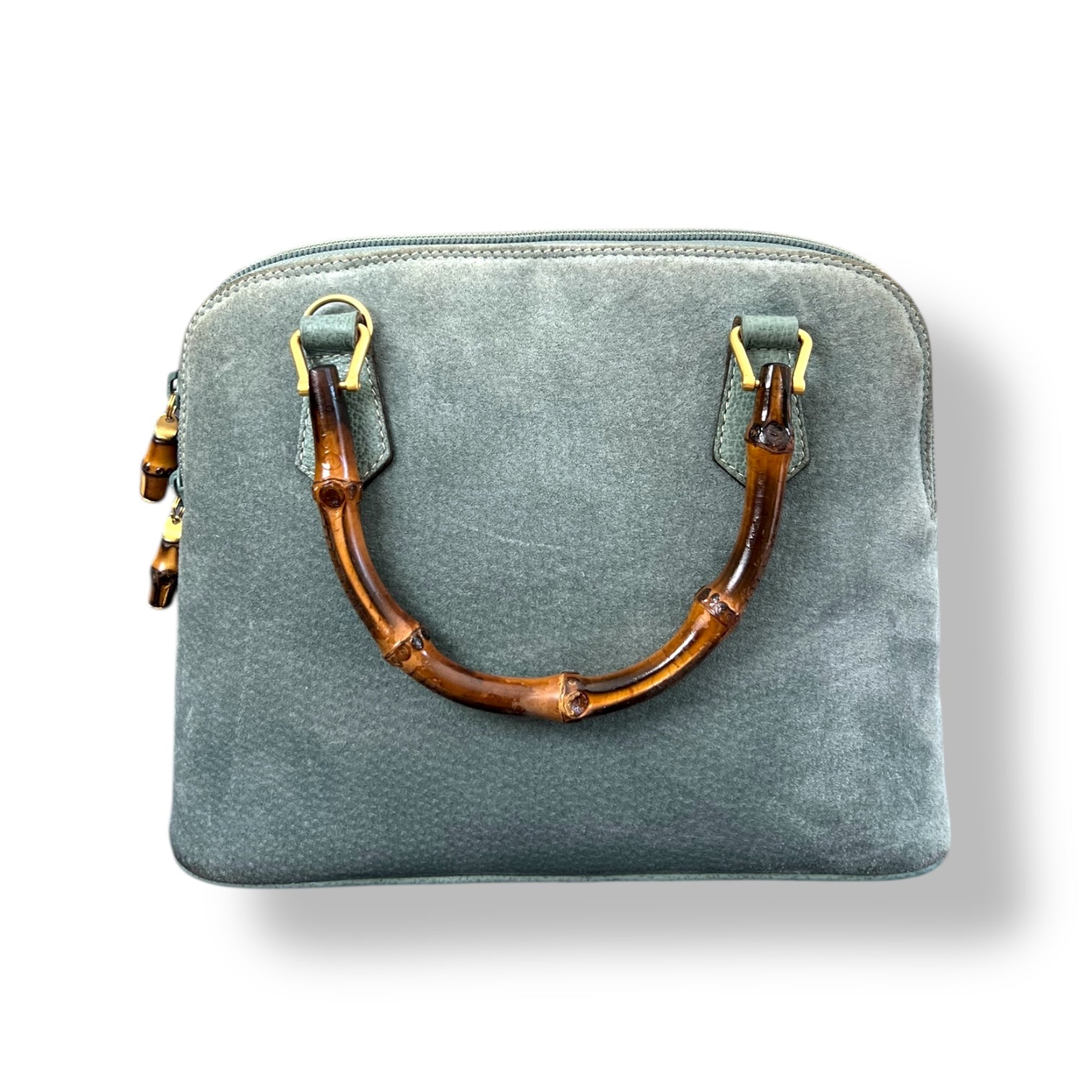 A timeless Gucci bamboo-handle bag in soft teal suede — elegant, understated, and unmistakably Gucci. The curved bamboo handles and matching bamboo zip pulls nod to the house’s iconic design heritage dating back to the 1940s, when Gucci artisans began using bamboo as a creative solution during postwar material shortages — a detail that went on to define the brand.