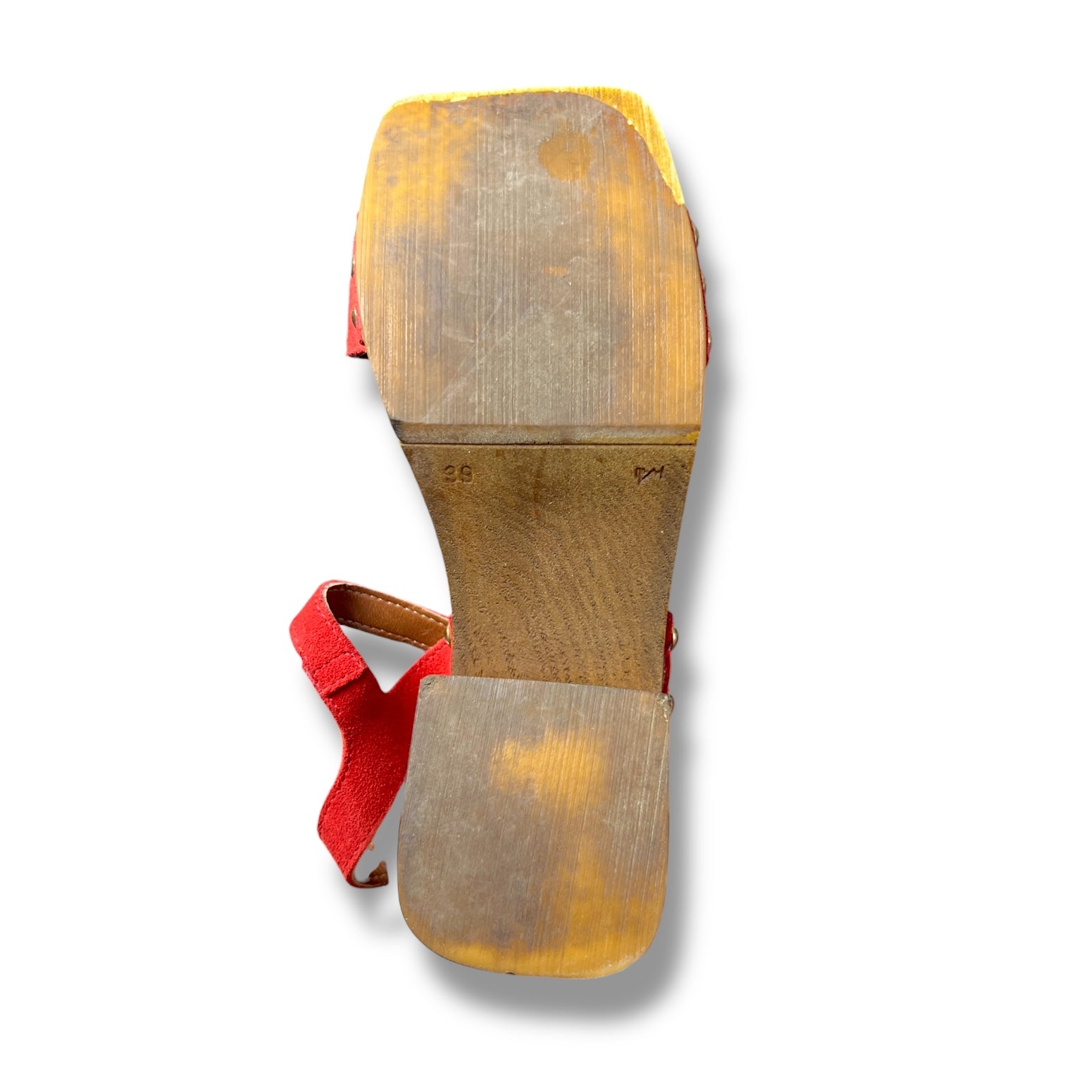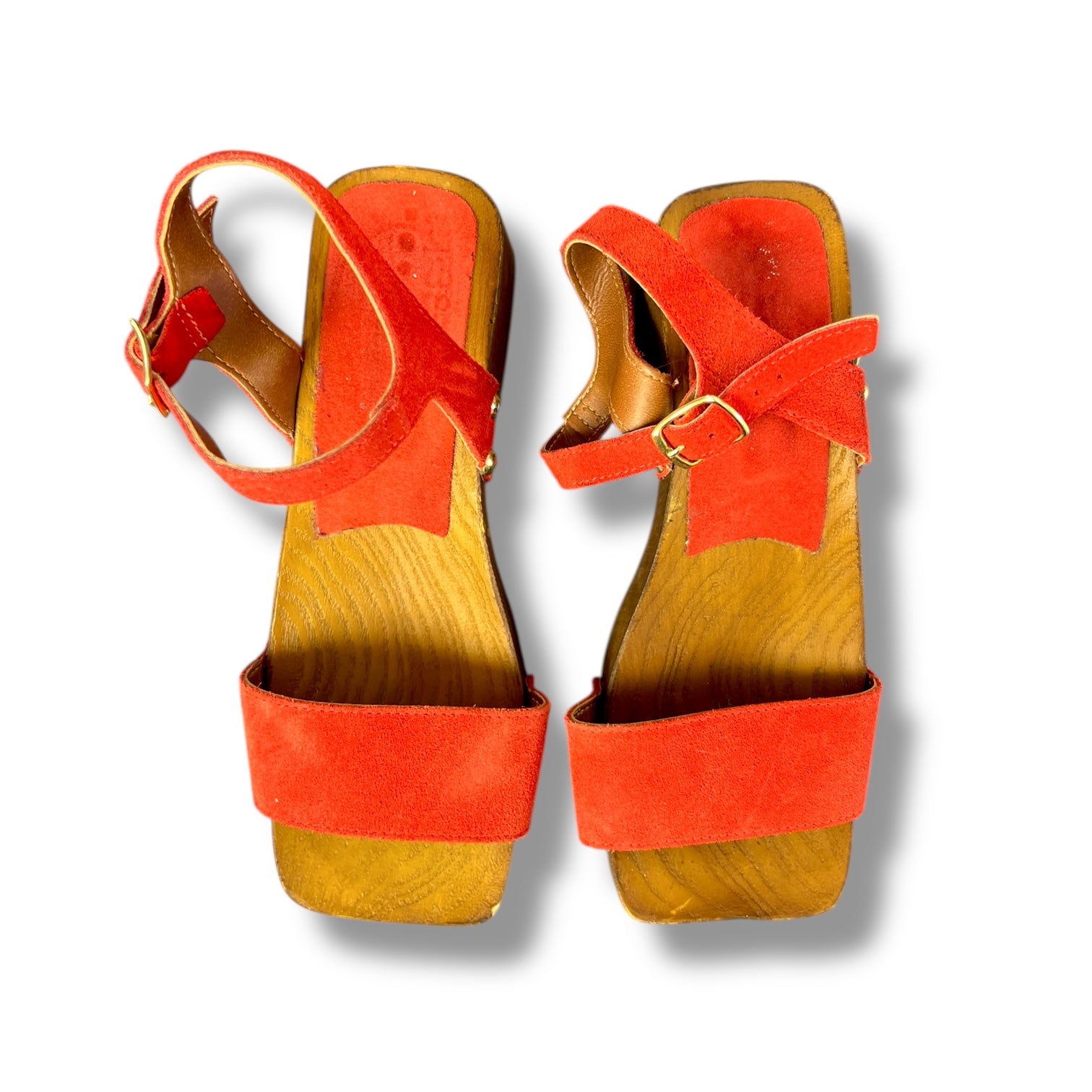 These Italian-made platform sandals are giving full 70s revival with a 90s attitude. The rich tomato-red suede upper contrasts beautifully against the sculptural faux-wood platform and block heel, finished with subtle gold stud detailing at the sides. The ankle strap with gold buckle keeps them secure while the open square toe keeps them cool.