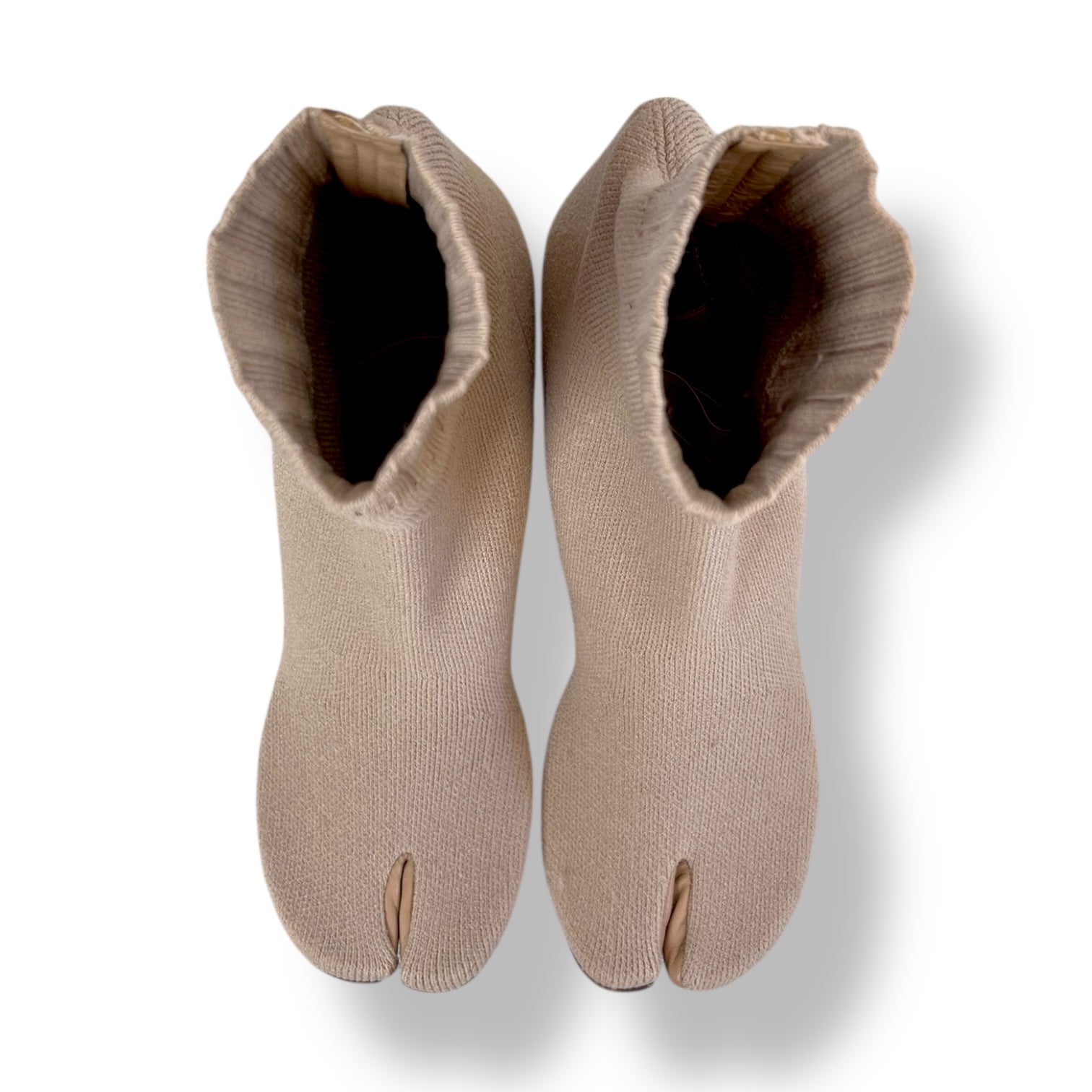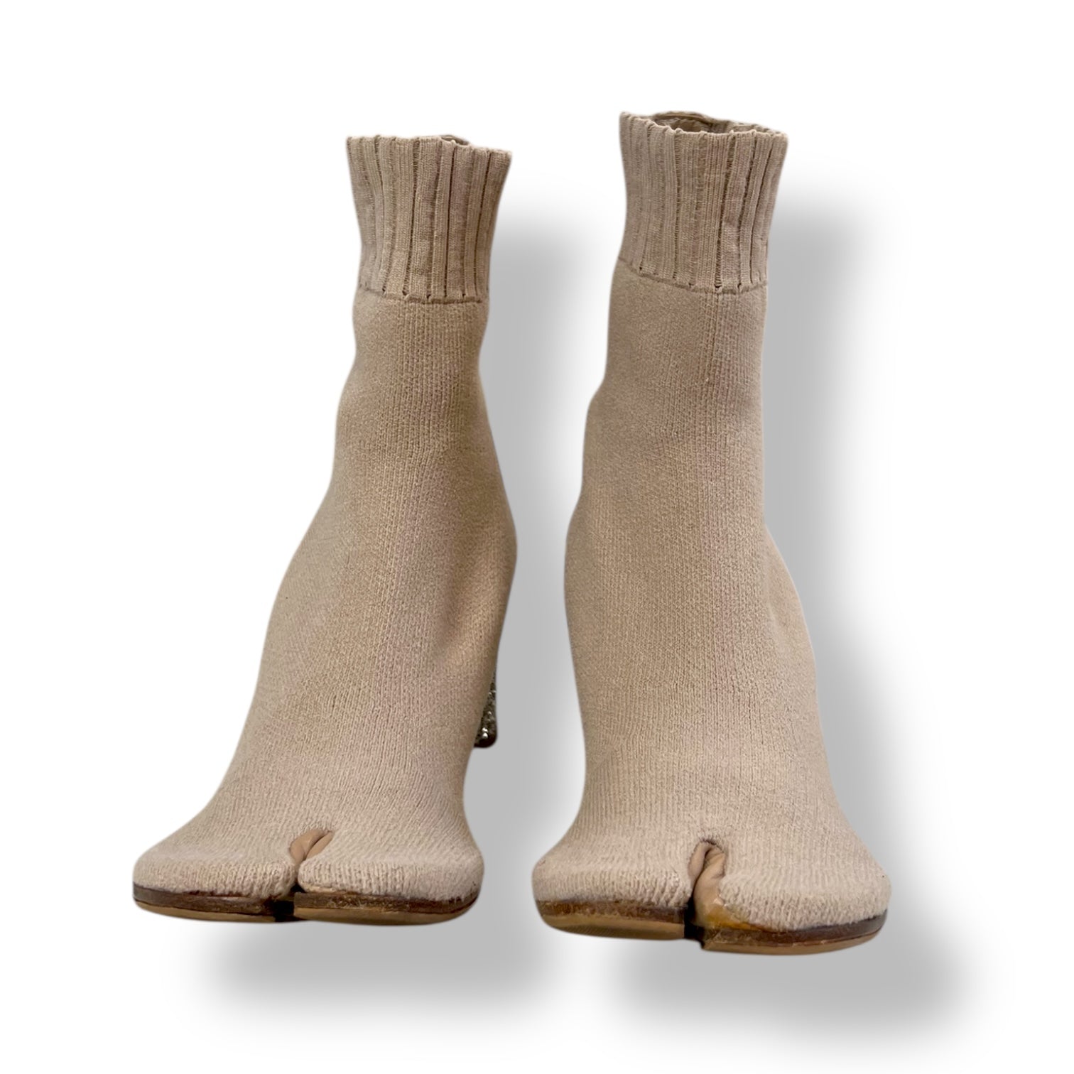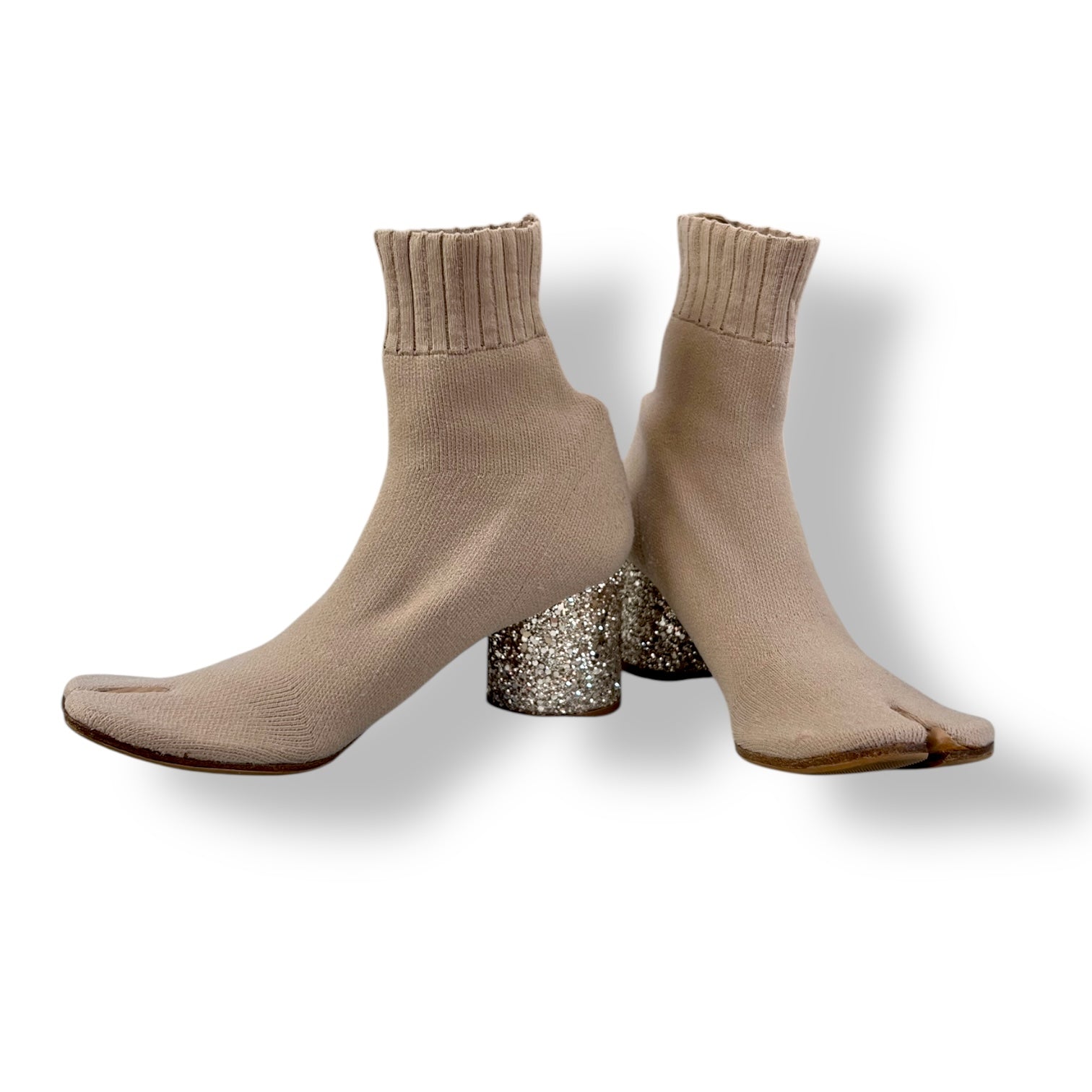 The cult classic, reimagined. These Maison Margiela Tabi ankle boots feature the brand’s iconic split-toe design in a soft beige stretch knit, set on shimmering silver glitter block heels. The perfect mix of avant-garde cool and wearable elegance — unmistakably Margiela.