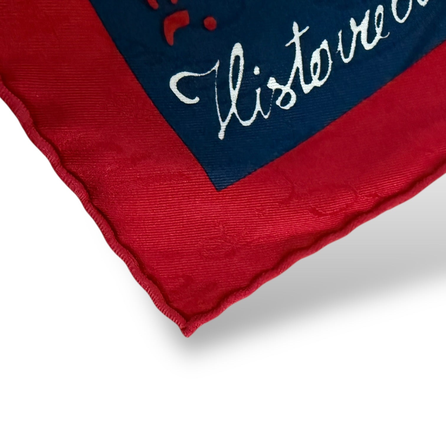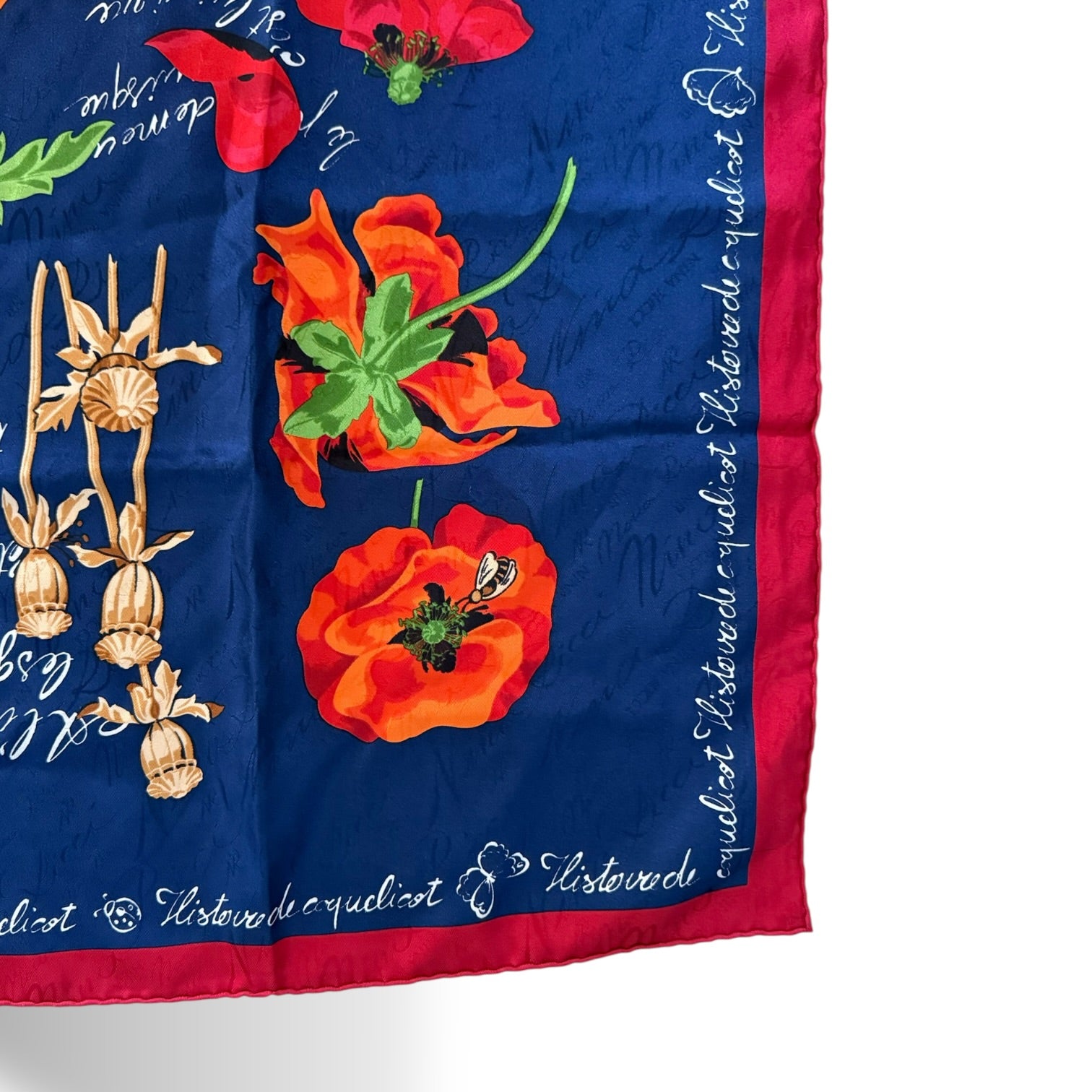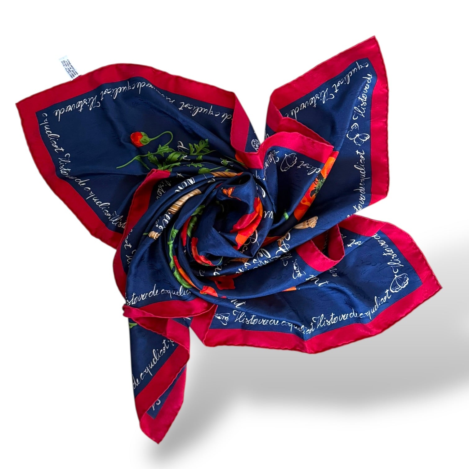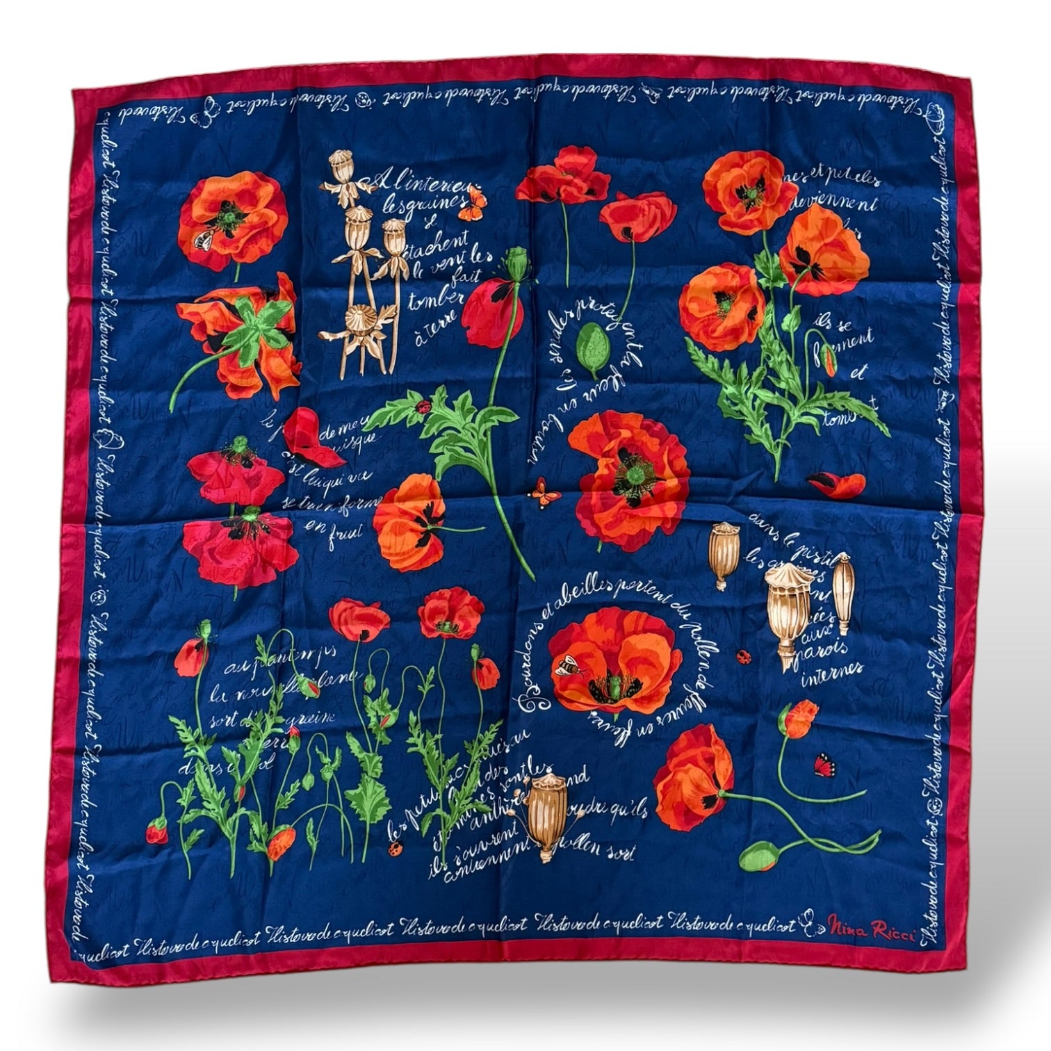 A beautiful vintage Nina Ricci silk scarf in a rich navy with bold red poppies and soft script detailing throughout. The bright red border frames it perfectly and gives it that classic, confident finish.