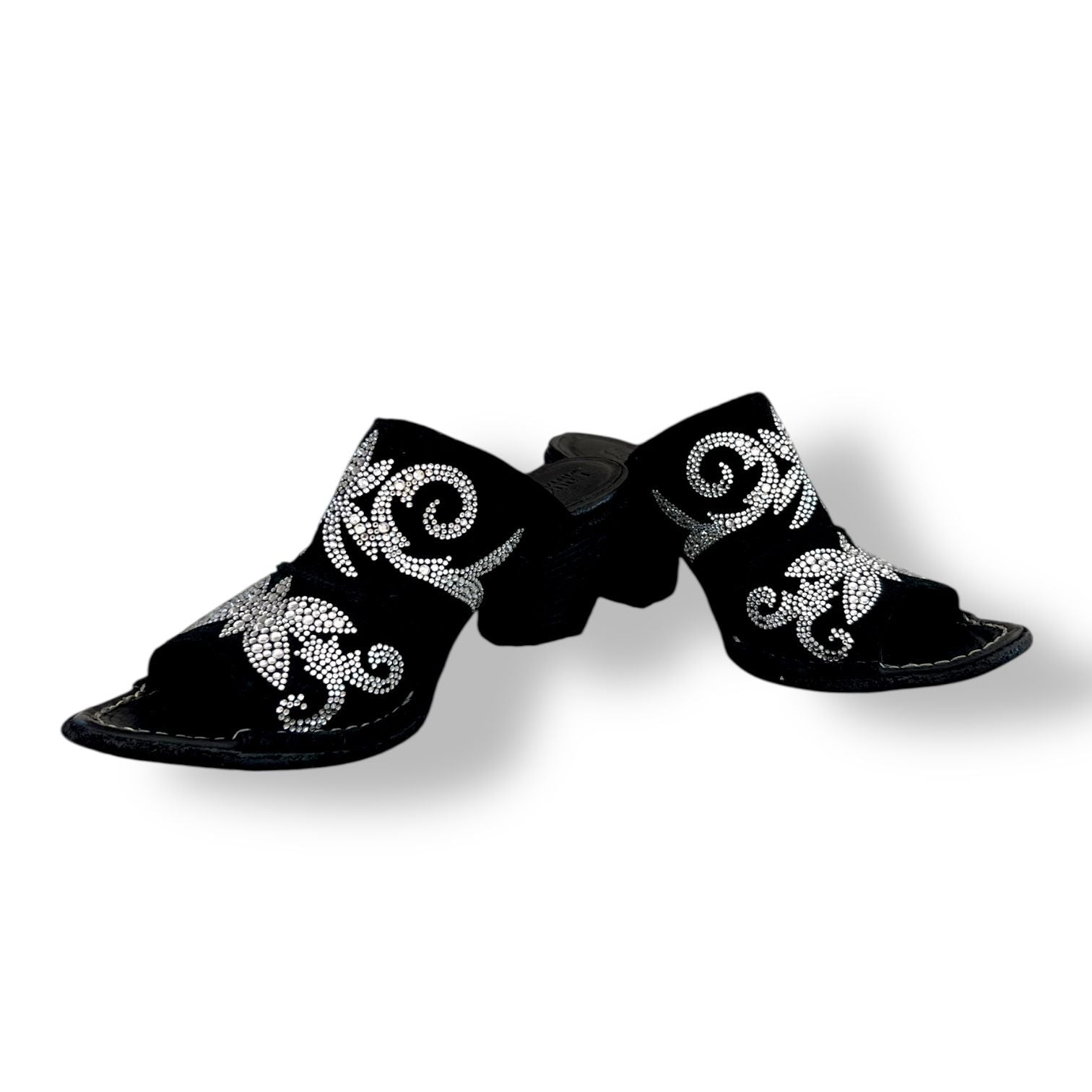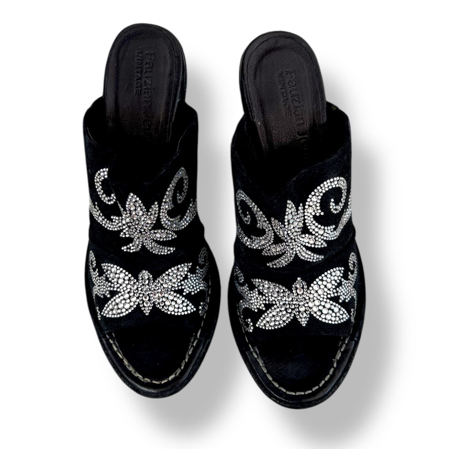 These incredible vintage Fiorentini + Baker mules bring just the right amount of Western drama — think classic cowgirl silhouette meets high-shine glamour. Made from rich black suede and studded with intricate crystal detailing, they’re statement shoes that don’t whisper — they shimmer.
