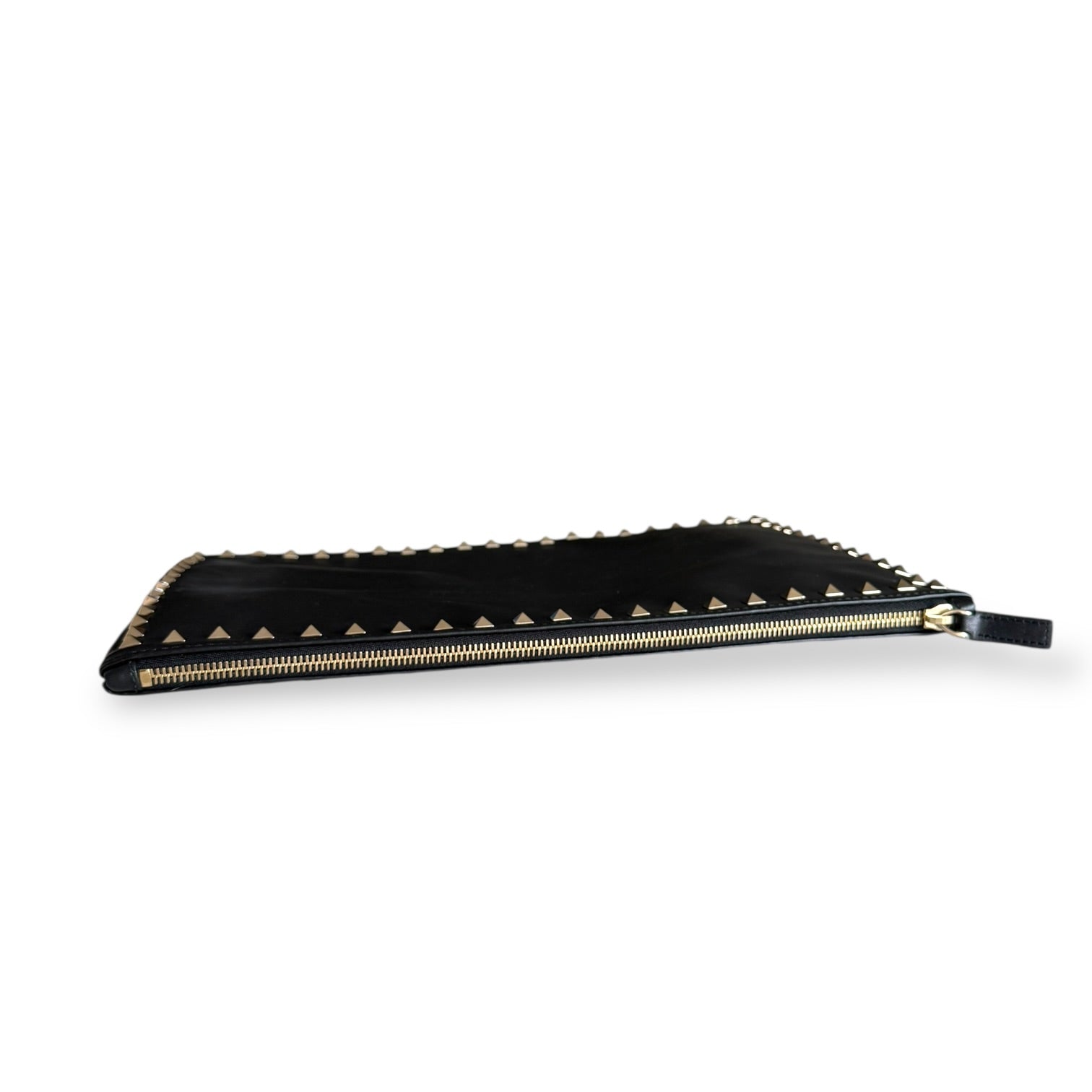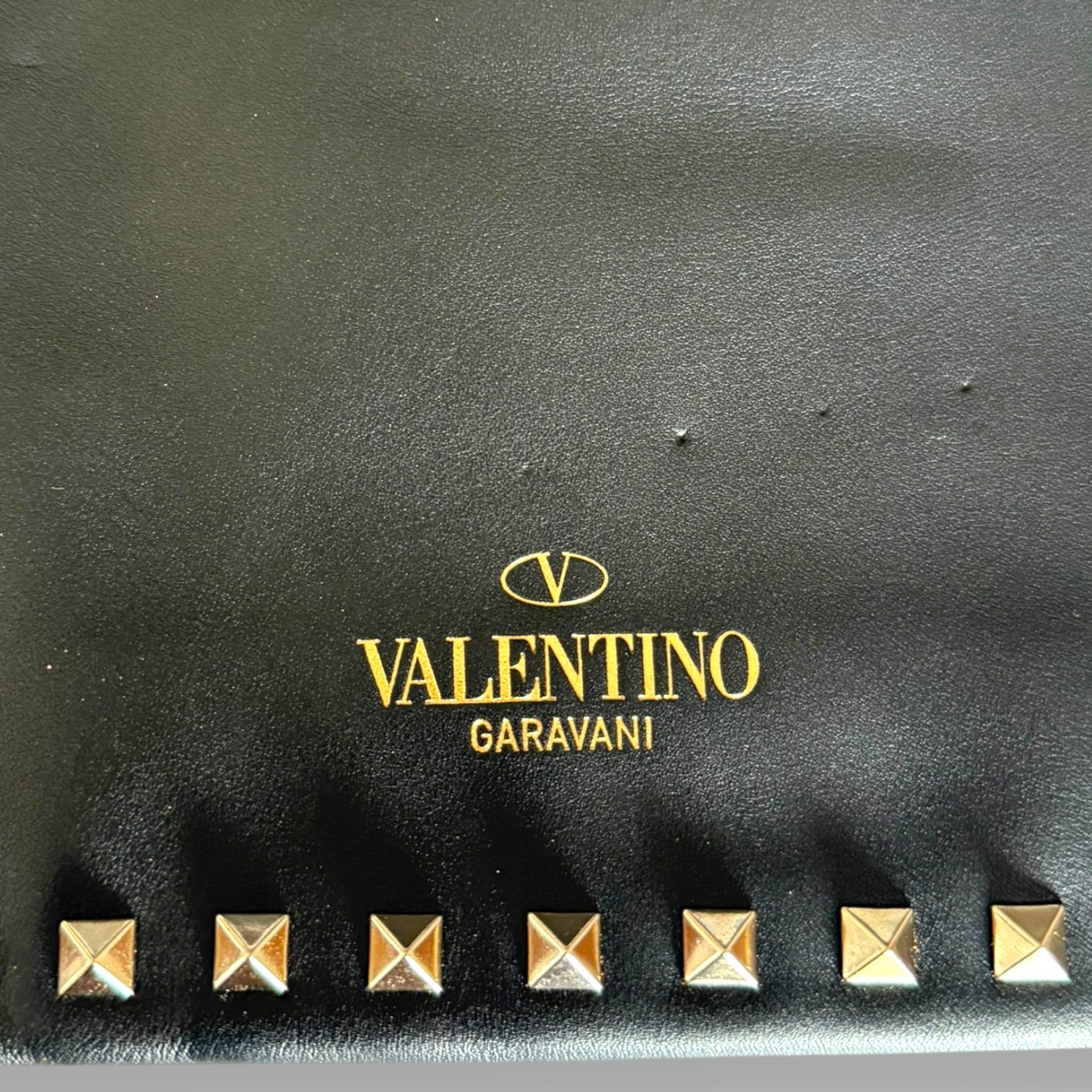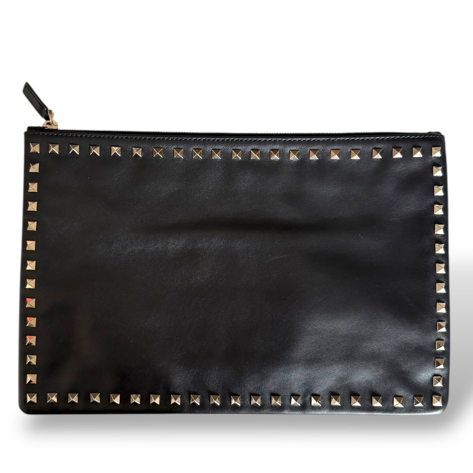 This is the clutch version, done in smooth black leather with the signature pyramid Rockstud trim framing the entire silhouette. The gold-tone hardware against the black leather is exactly what makes these so striking—it’s clean, sharp, and unmistakably Valentino. The branding is kept minimal with the gold “Valentino Garavani” stamp, letting the studs do the talking.