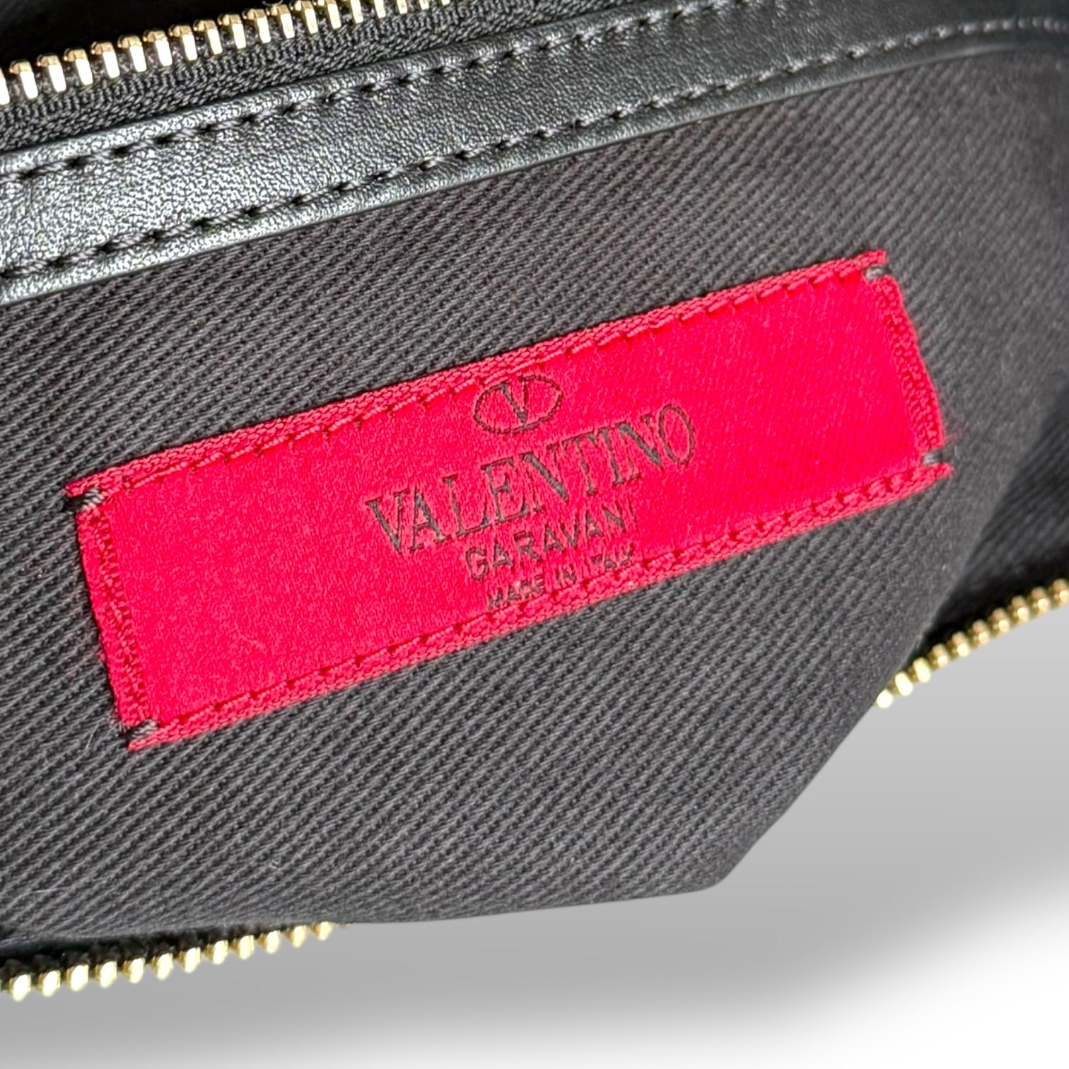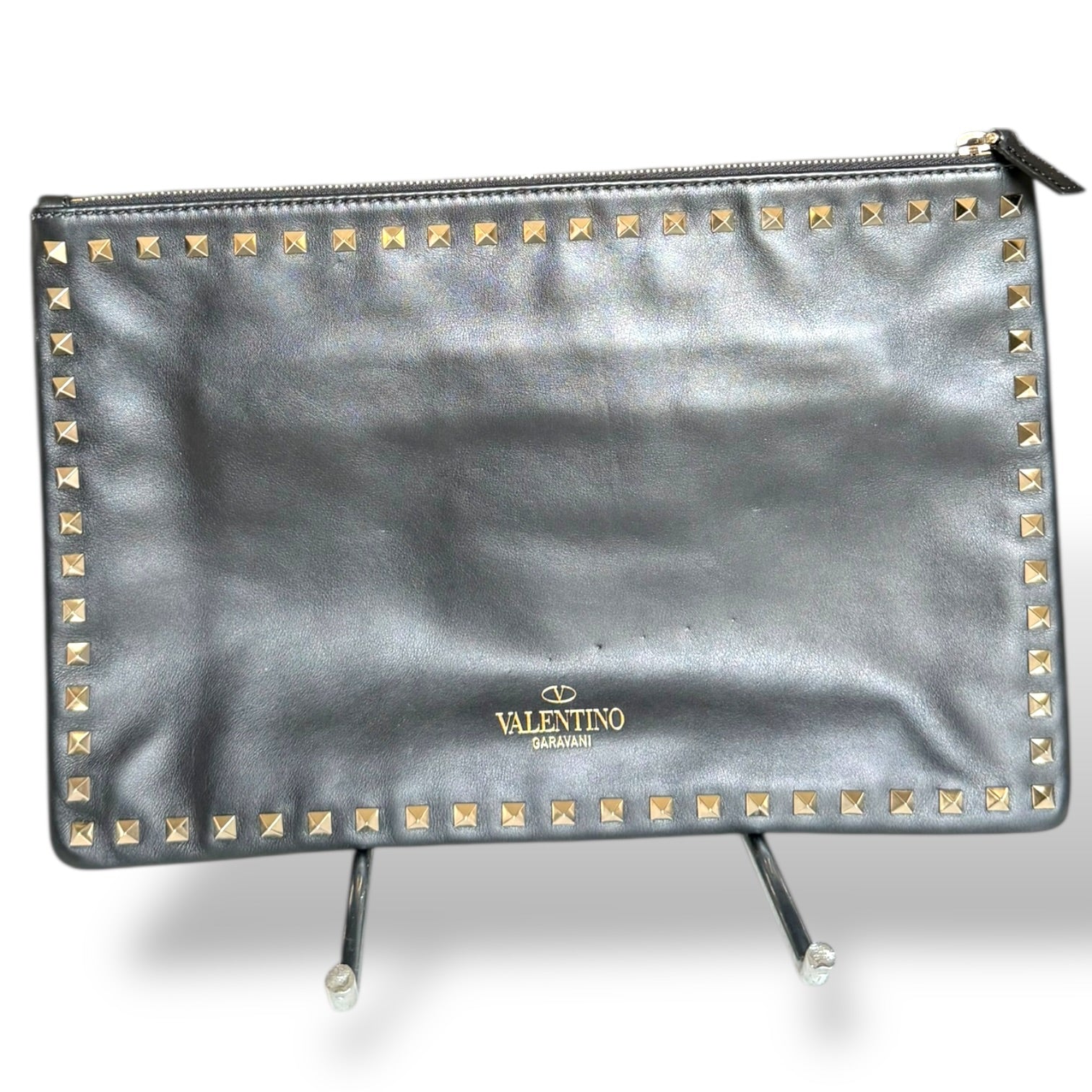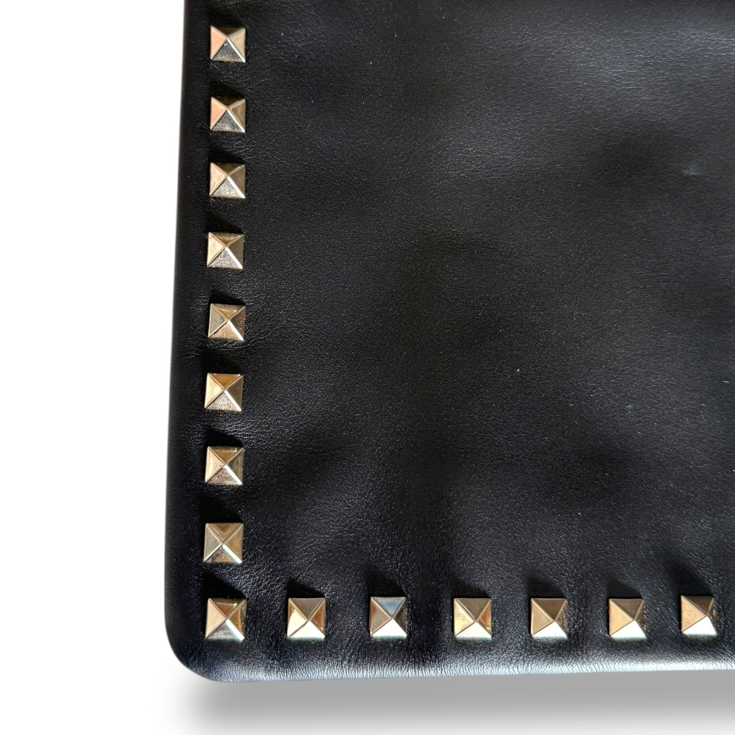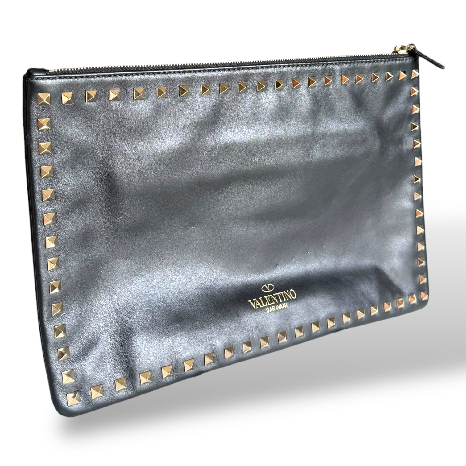 This is the clutch version, done in smooth black leather with the signature pyramid Rockstud trim framing the entire silhouette. The gold-tone hardware against the black leather is exactly what makes these so striking—it’s clean, sharp, and unmistakably Valentino. The branding is kept minimal with the gold “Valentino Garavani” stamp, letting the studs do the talking.