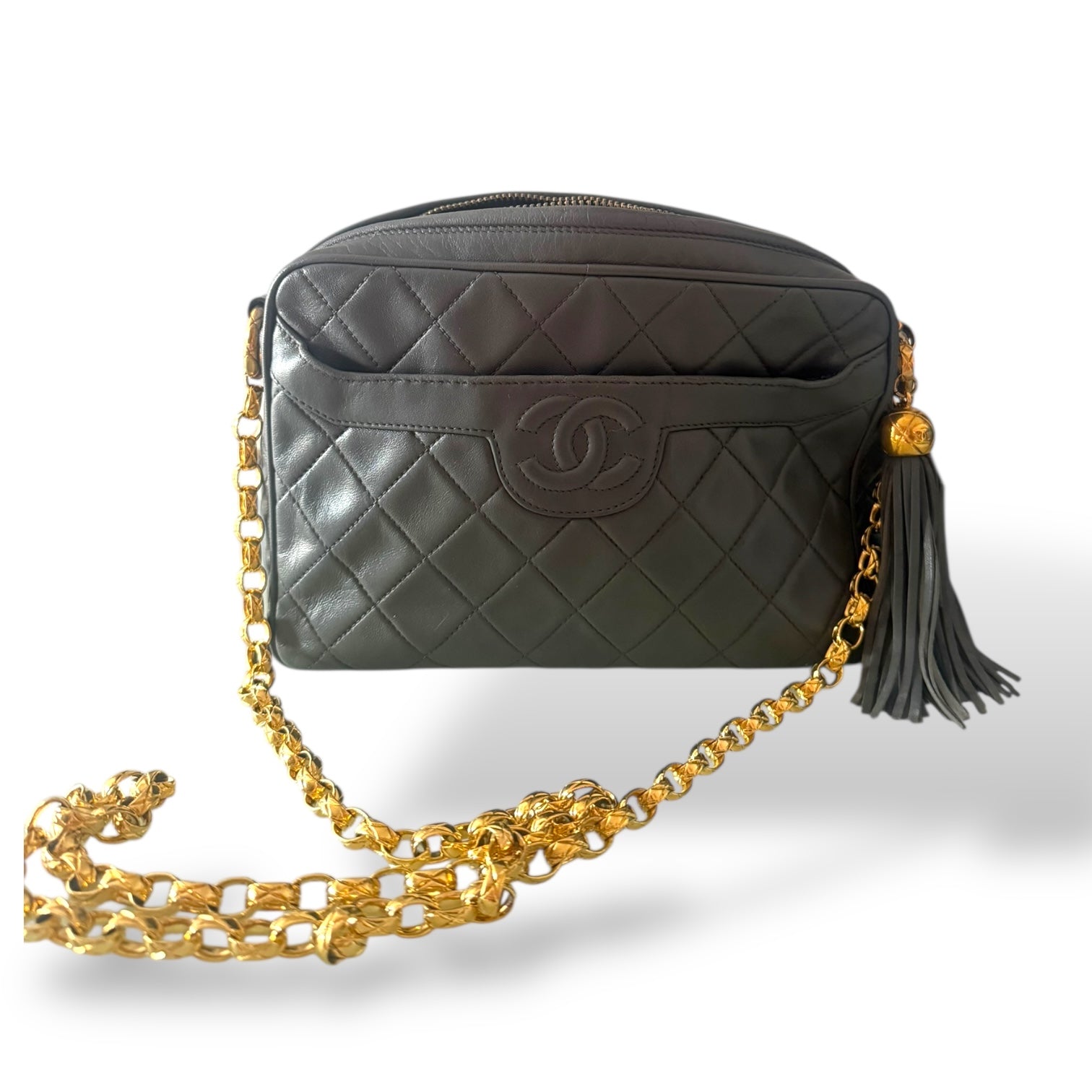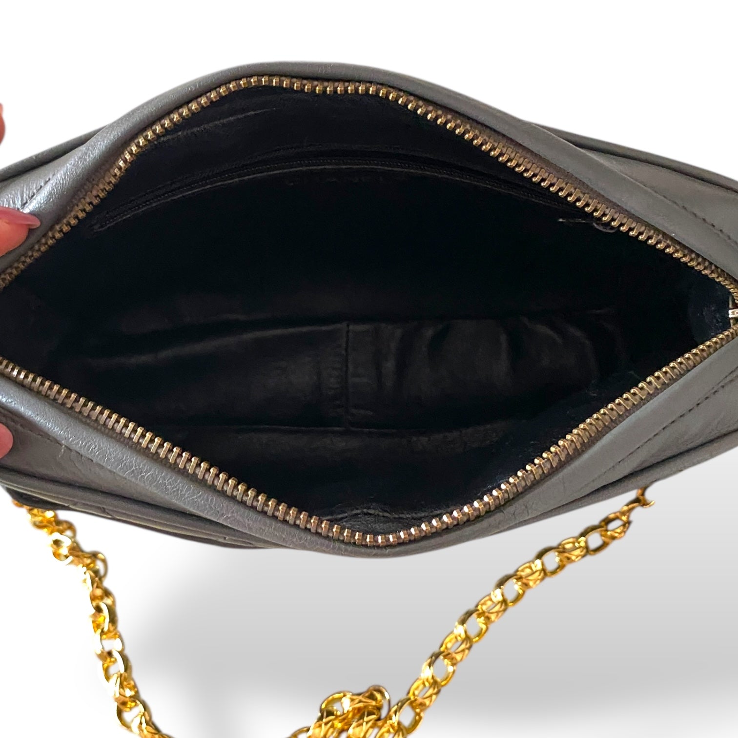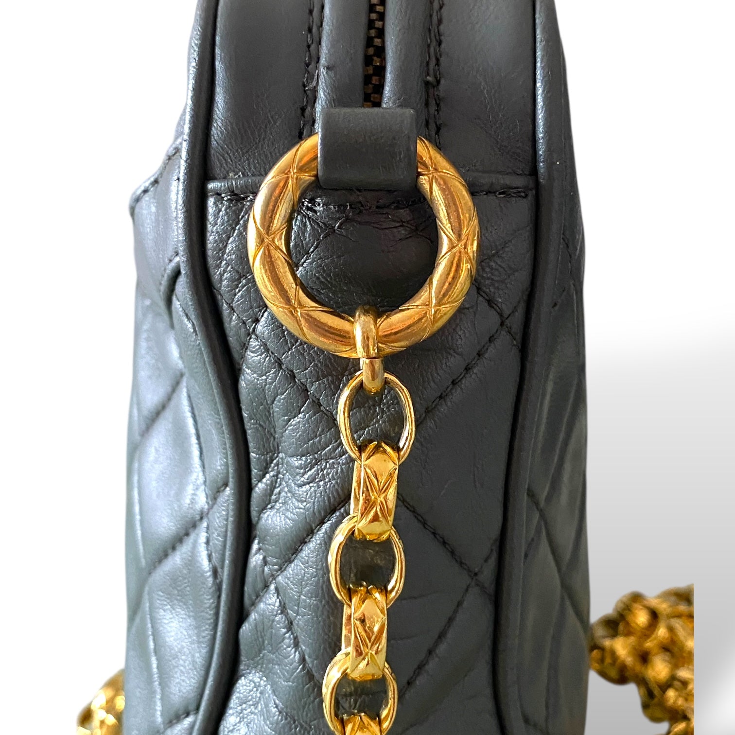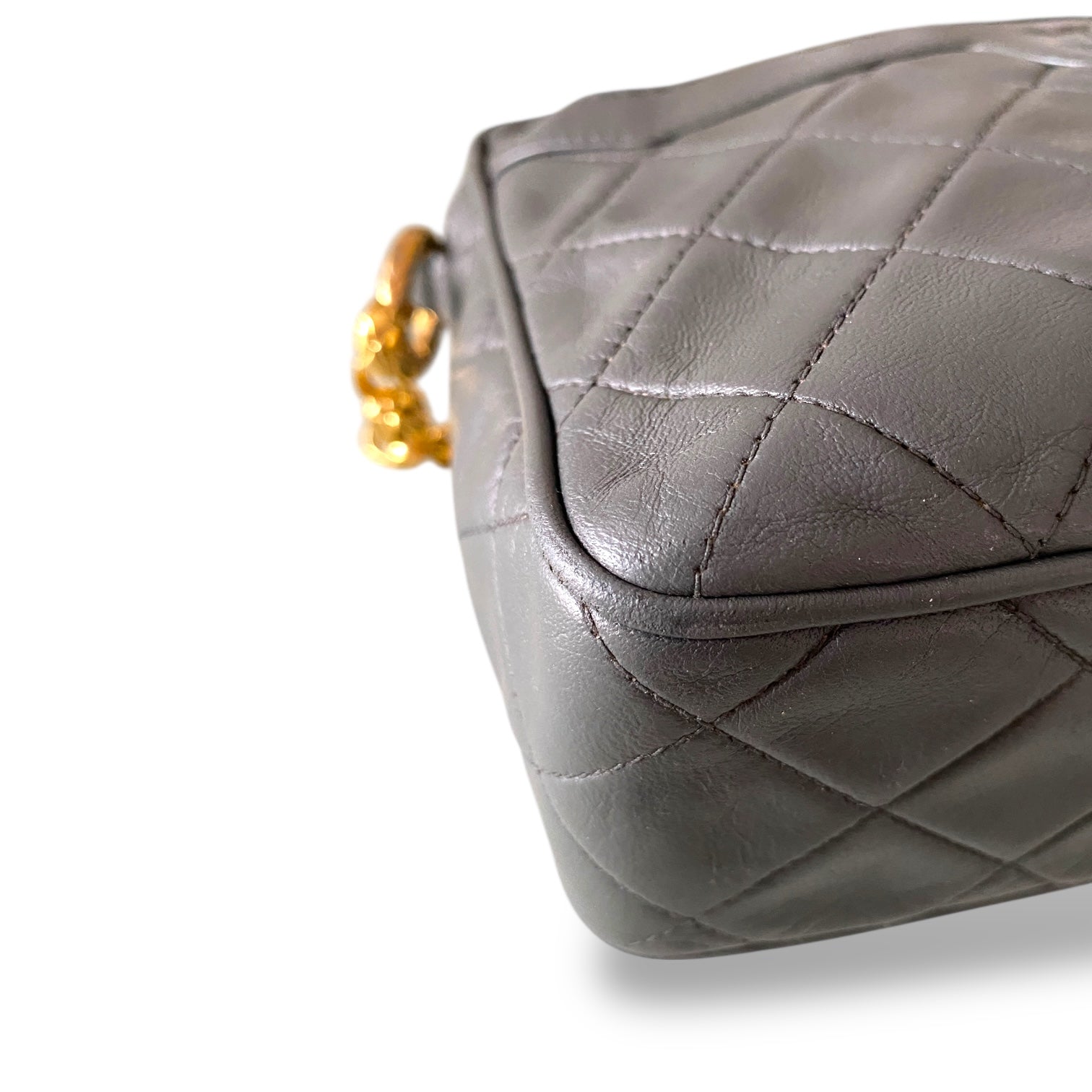 This elegant Chanel camera bag is crafted from soft quilted grey lambskin and finished with classic gold-plated hardware, a combination that feels both refined and quietly striking. The grey tone is sophisticated and versatile — softer than black, but just as timeless — and pairs beautifully with the warmth of the gold hardware.