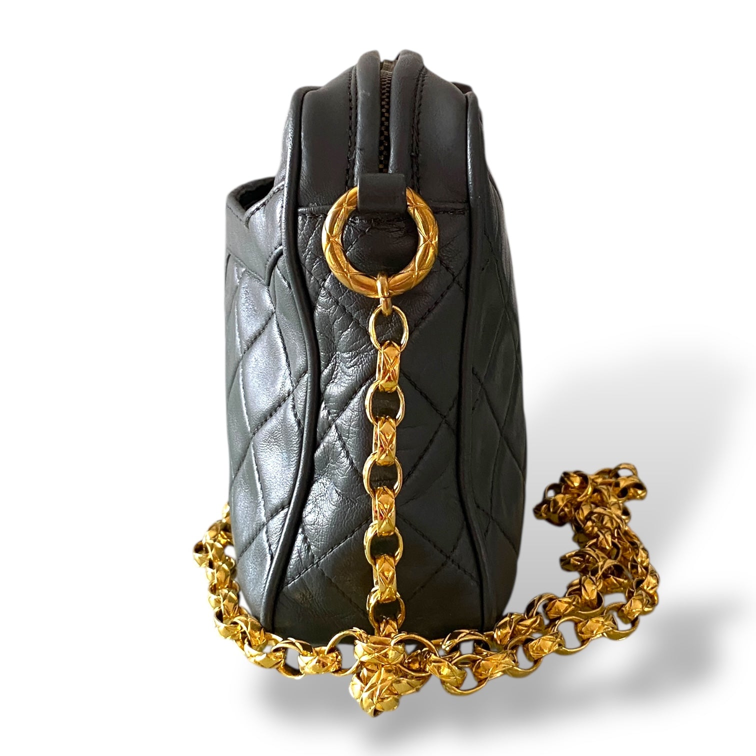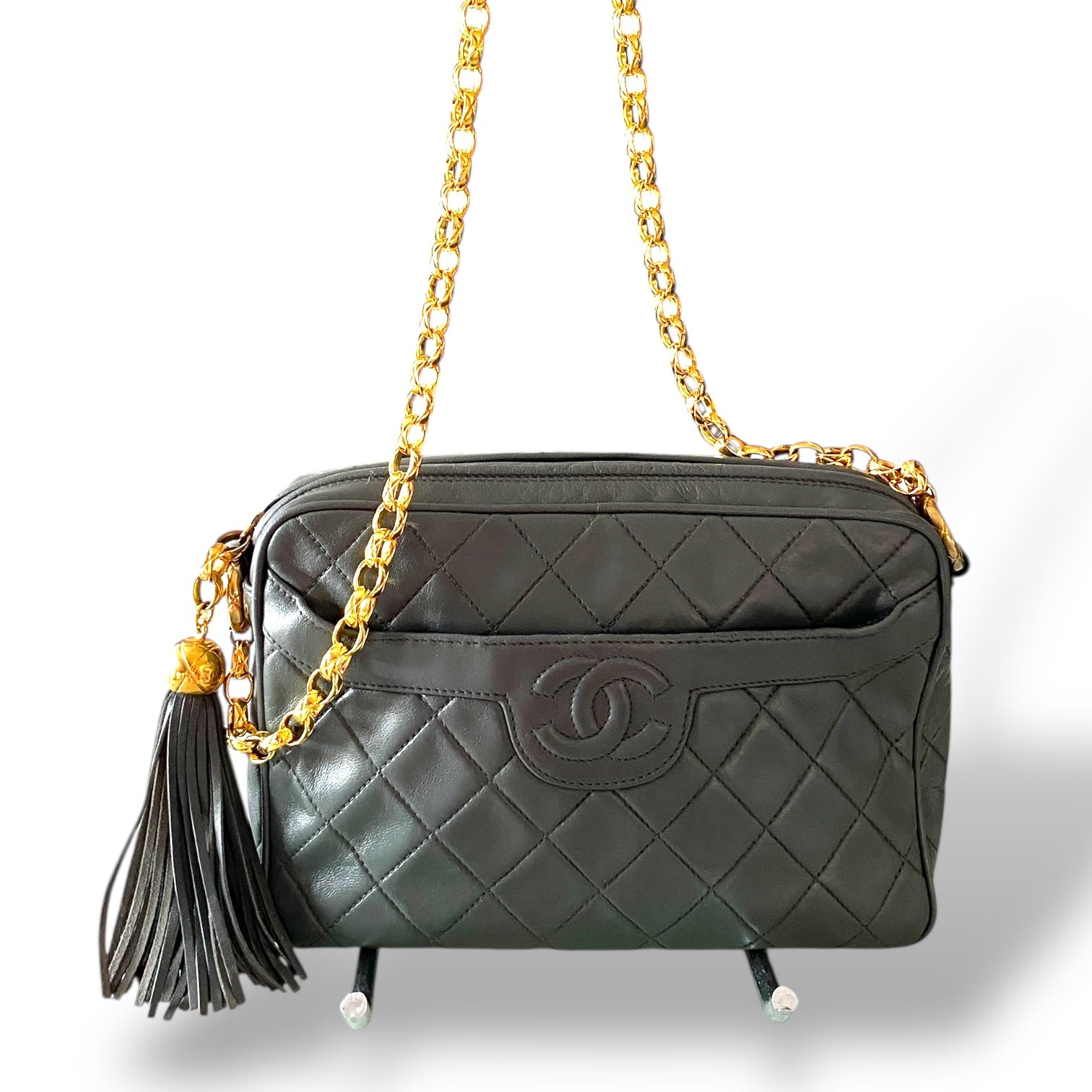 The structured camera silhouette is one of Chanel’s most wearable designs, offering a compact yet practical shape that sits comfortably crossbody or on the shoulder. The bag features diamond quilting, an exterior stitched CC logo, and a substantial gold chain strap that gives the piece weight and presence.