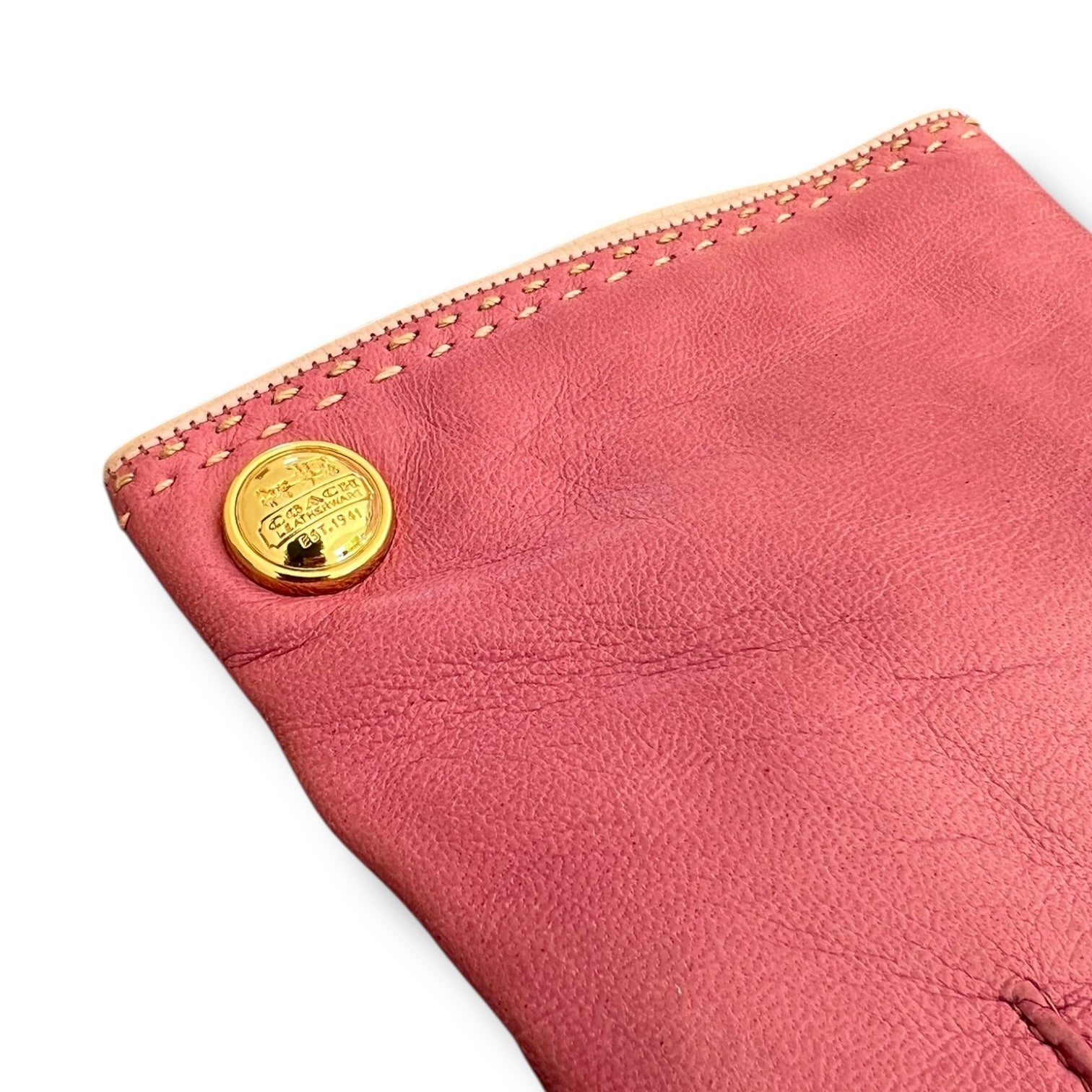 A seriously chic pair of vintage Coach gloves in a buttery-soft lipstick pink leather—just the right side of playful and polished. The longer gauntlet cut gives them a touch of drama, while the gold button hardware stamped with “Coach Leatherware Est. 1941” adds that perfect vintage prestige. Lined in a warm, ribbed wool knit, they’re as practical as they are fabulous.
