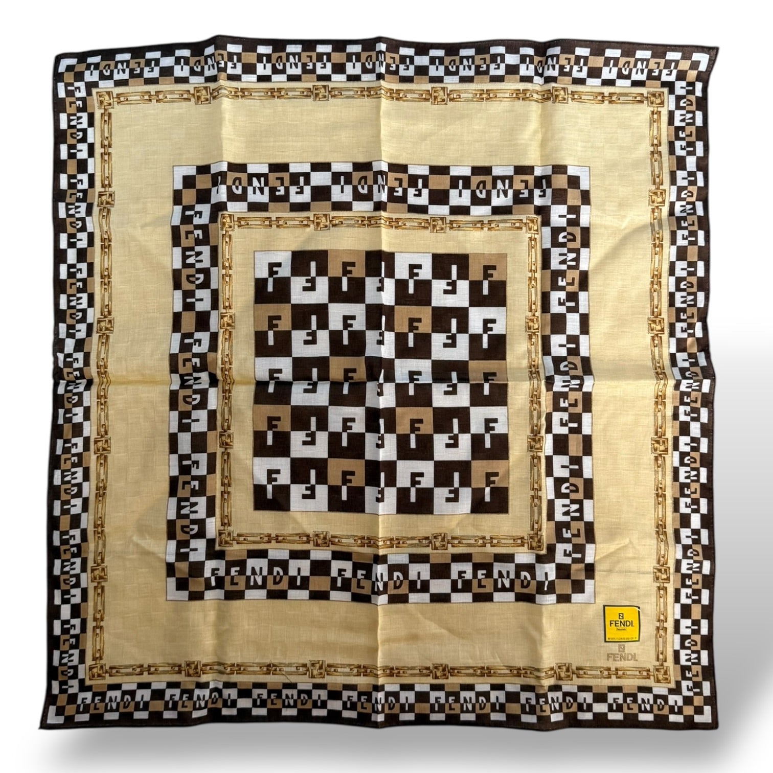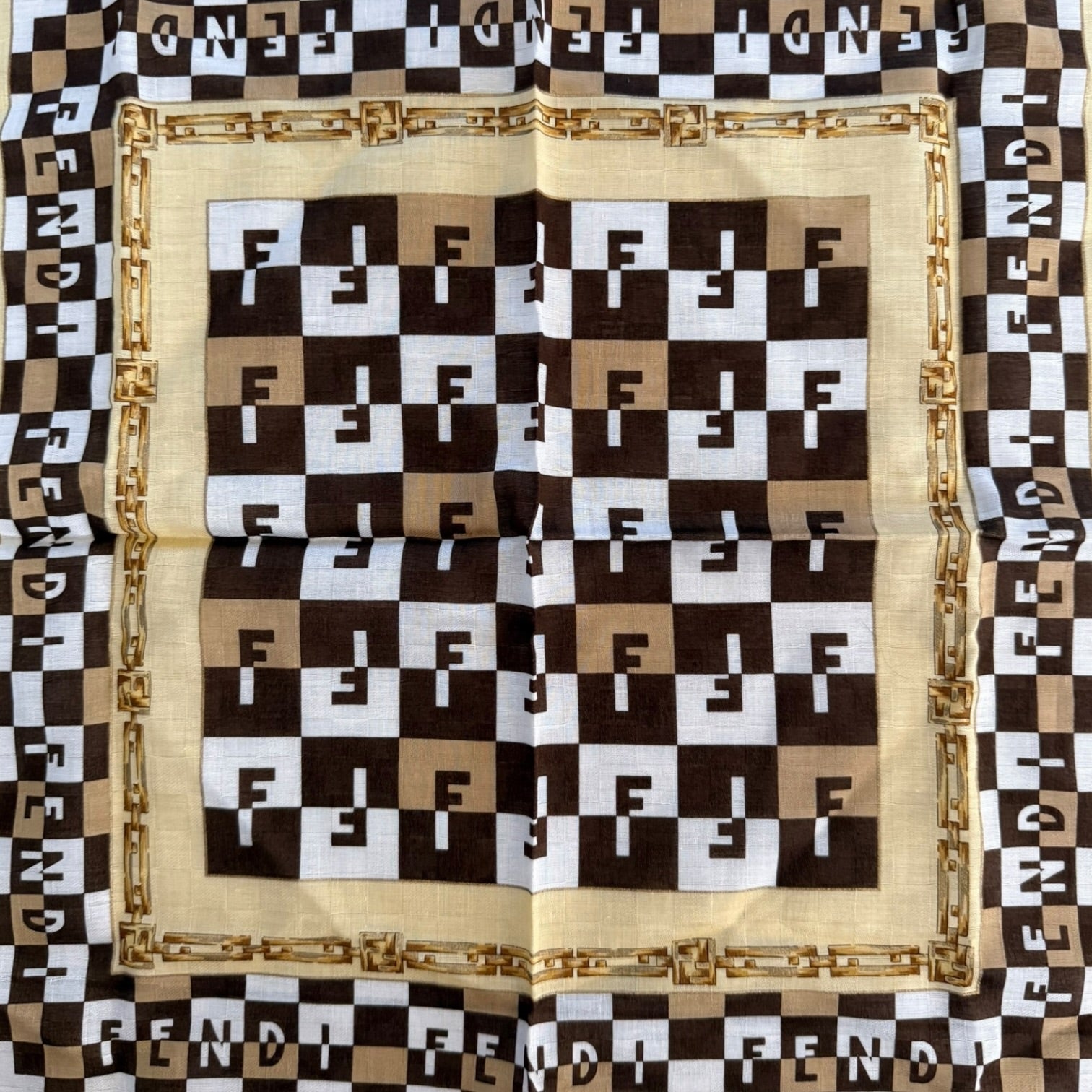 An iconic vintage Fendi scarf featuring the classic brown and beige checkerboard FF motif, framed with bold FENDI lettering and gold chain detailing. It’s giving full Y2K logo energy — understated but unmistakable.