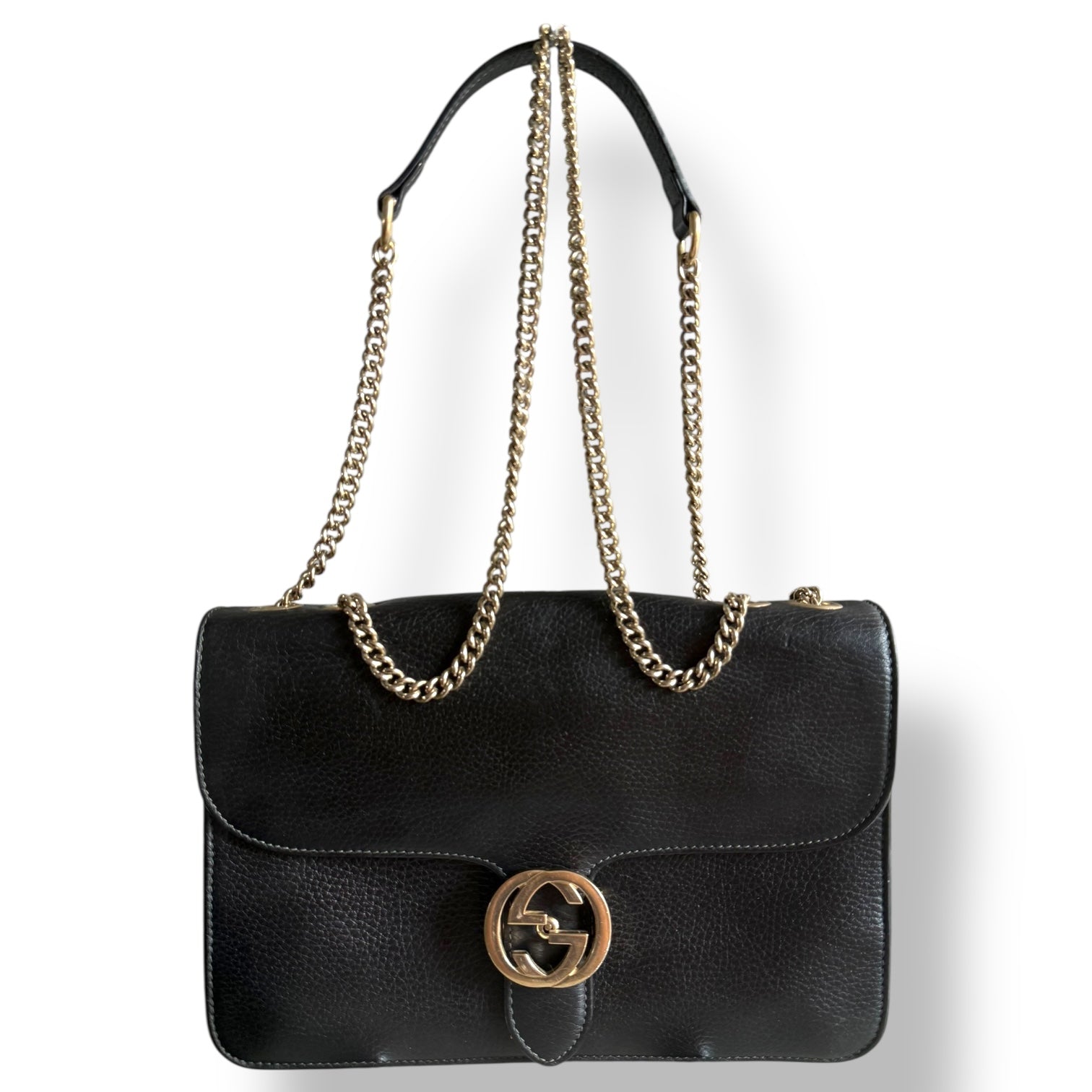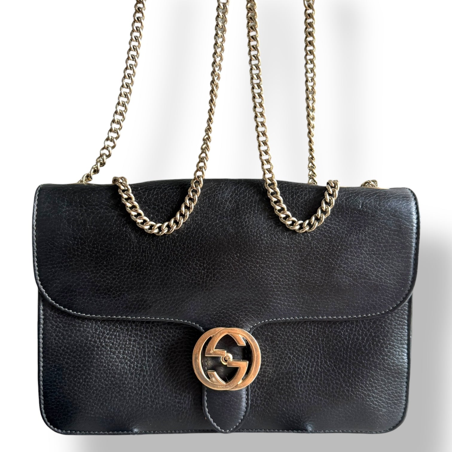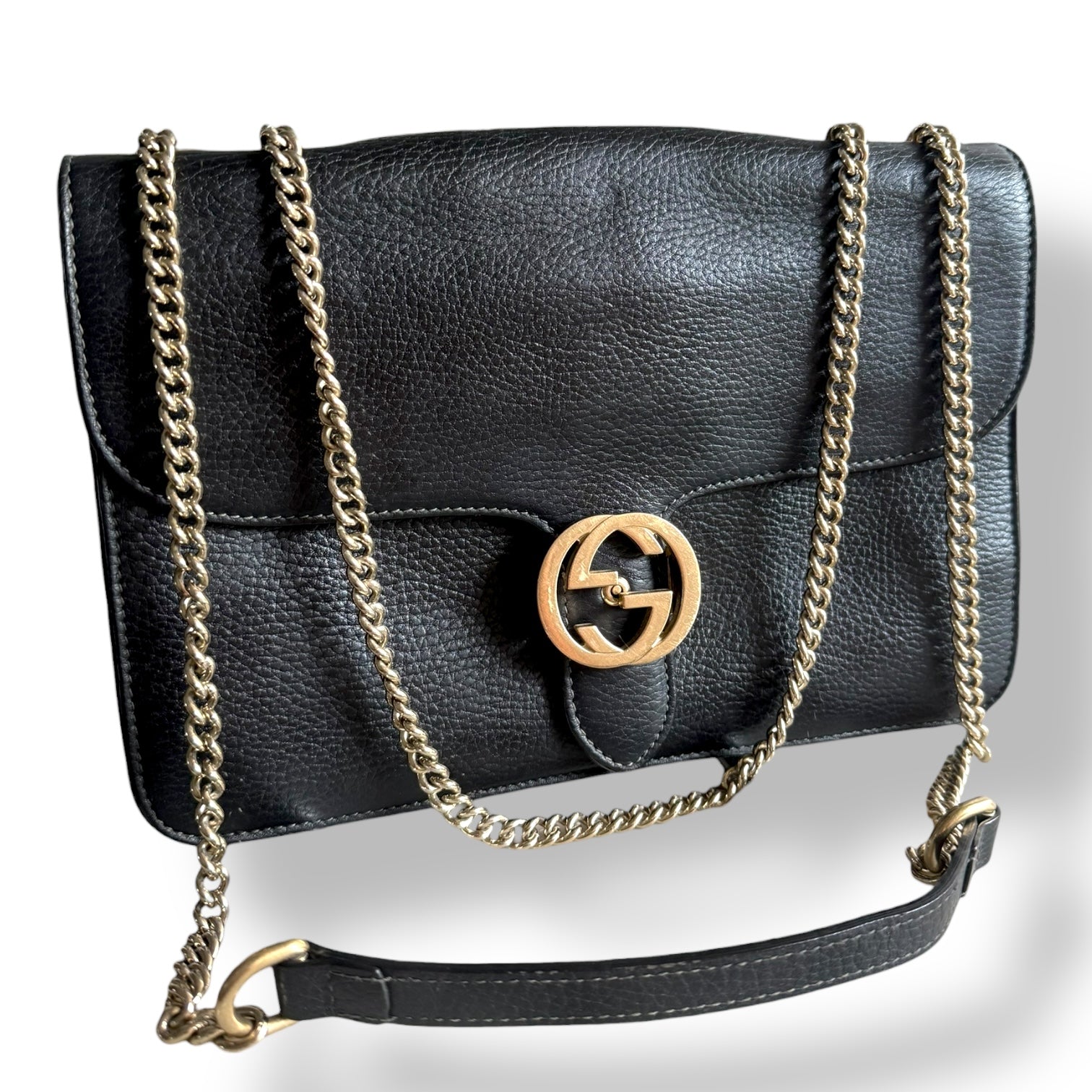 A sleek and quietly iconic vintage Gucci in supple black pebbled leather, finished with the classic Interlocking GG clasp in warm gold-tone metal. The long chain strap with a leather shoulder panel gives you effortless versatility — wear it crossbody or as a chic shoulder bag.