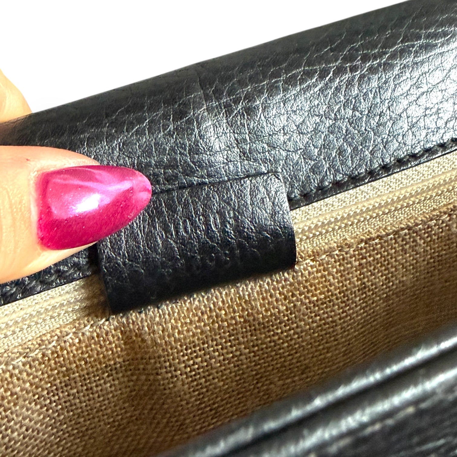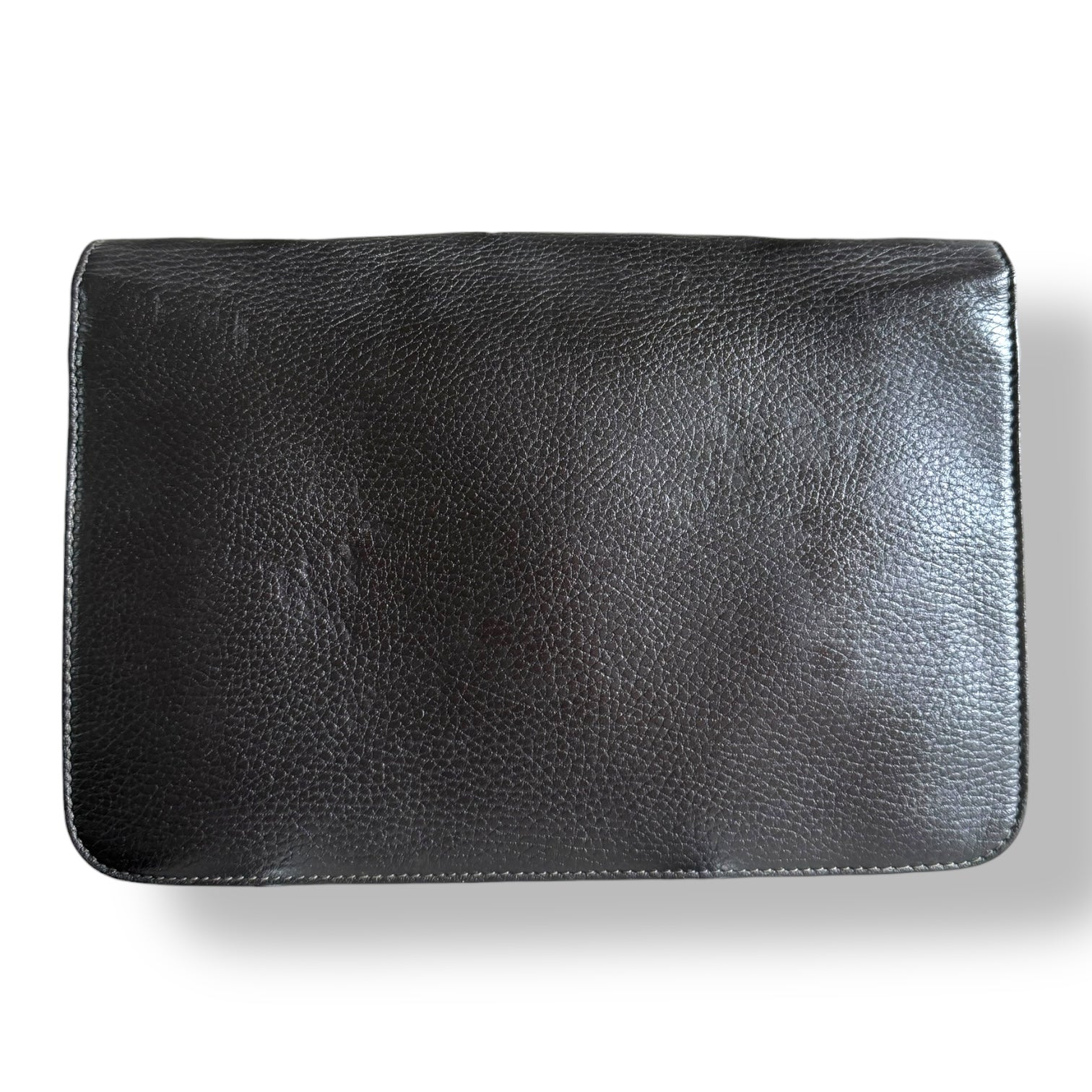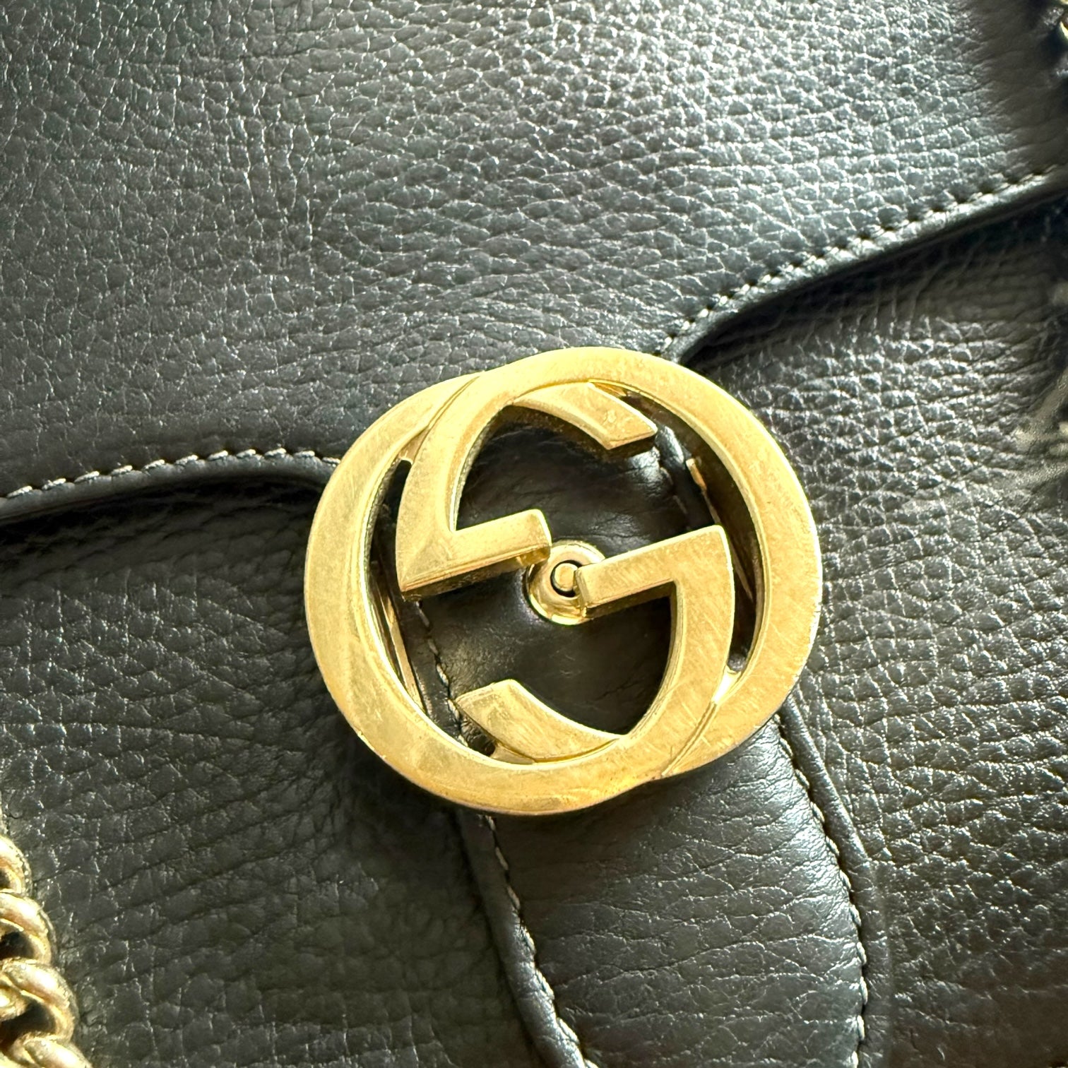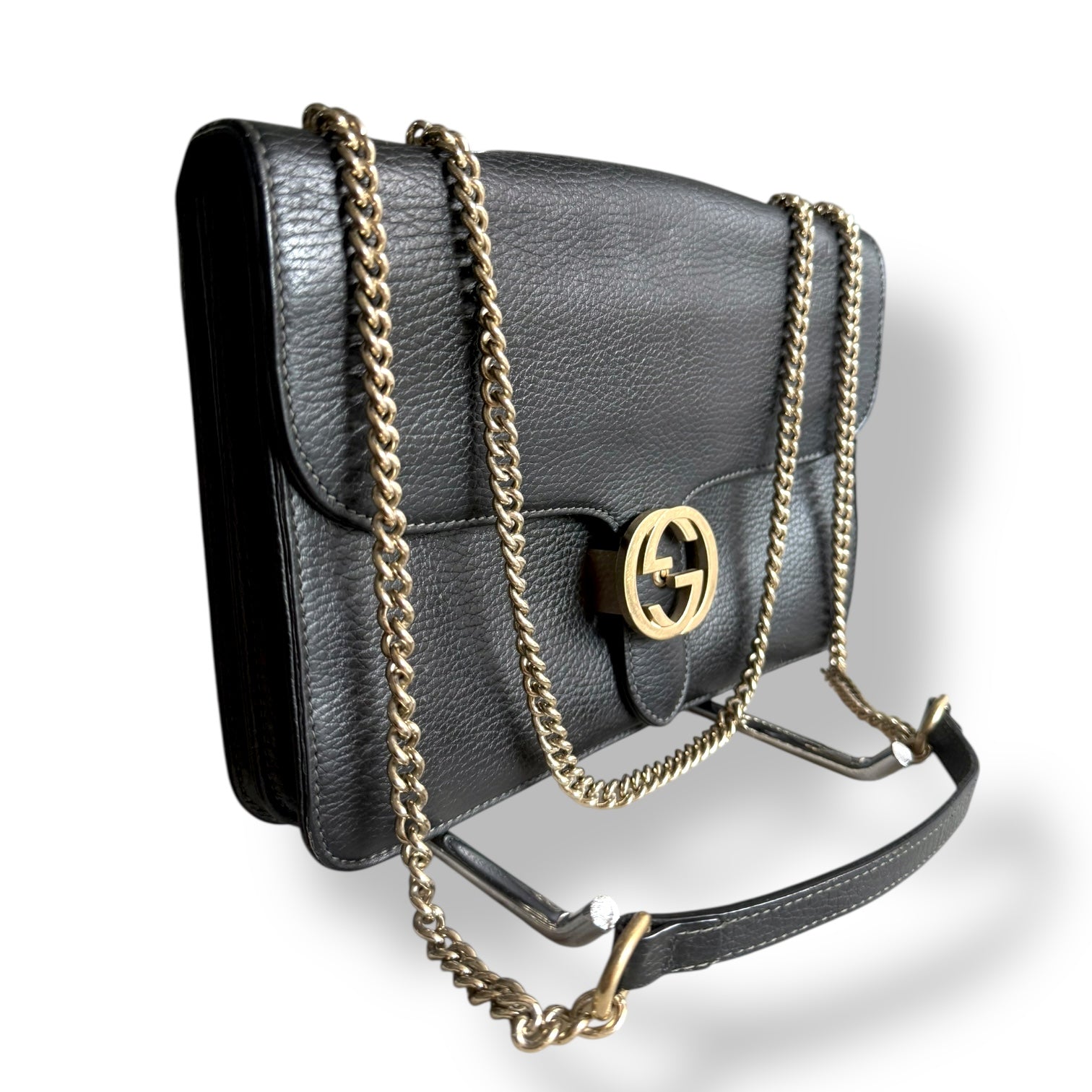 A sleek and quietly iconic vintage Gucci in supple black pebbled leather, finished with the classic Interlocking GG clasp in warm gold-tone metal. The long chain strap with a leather shoulder panel gives you effortless versatility — wear it crossbody or as a chic shoulder bag.