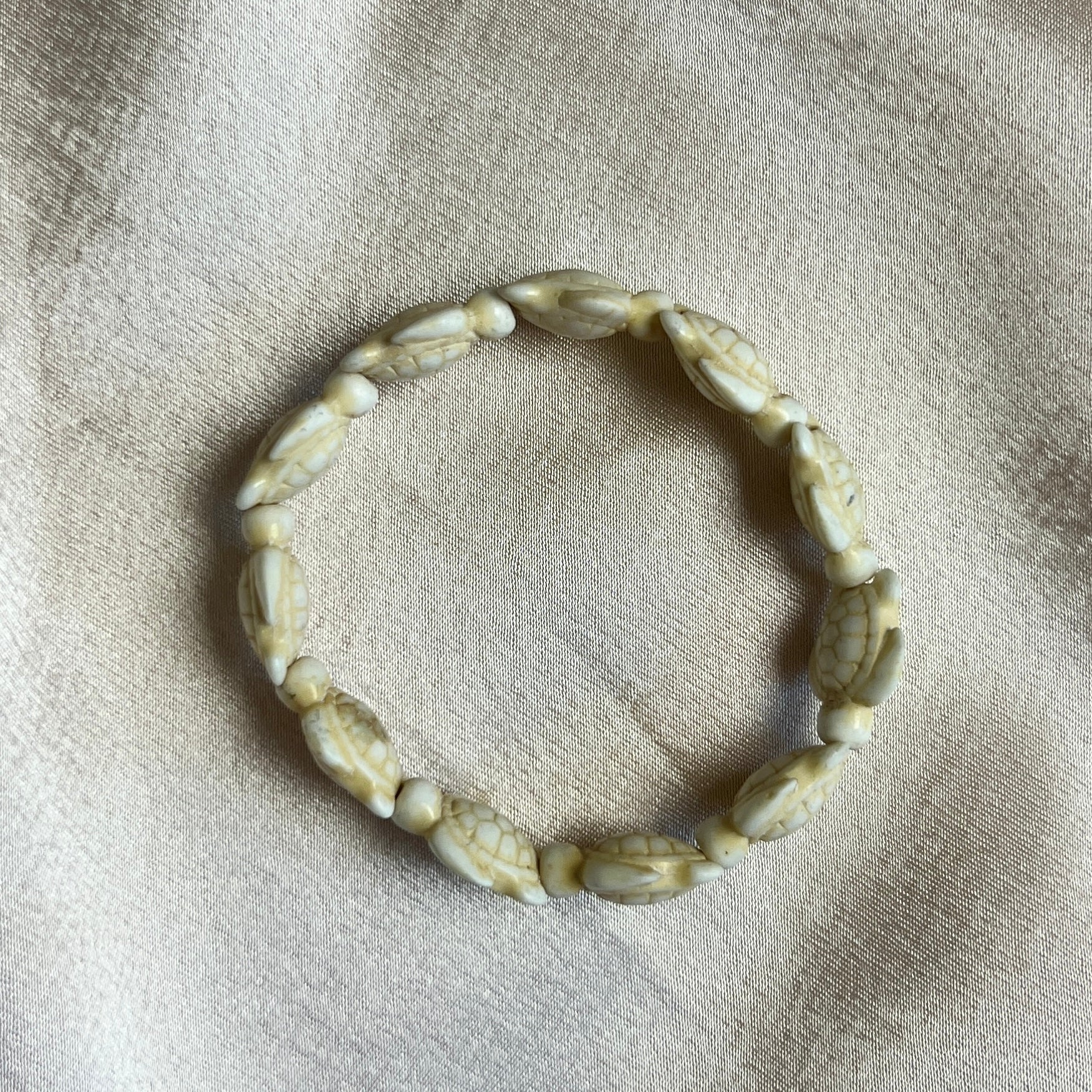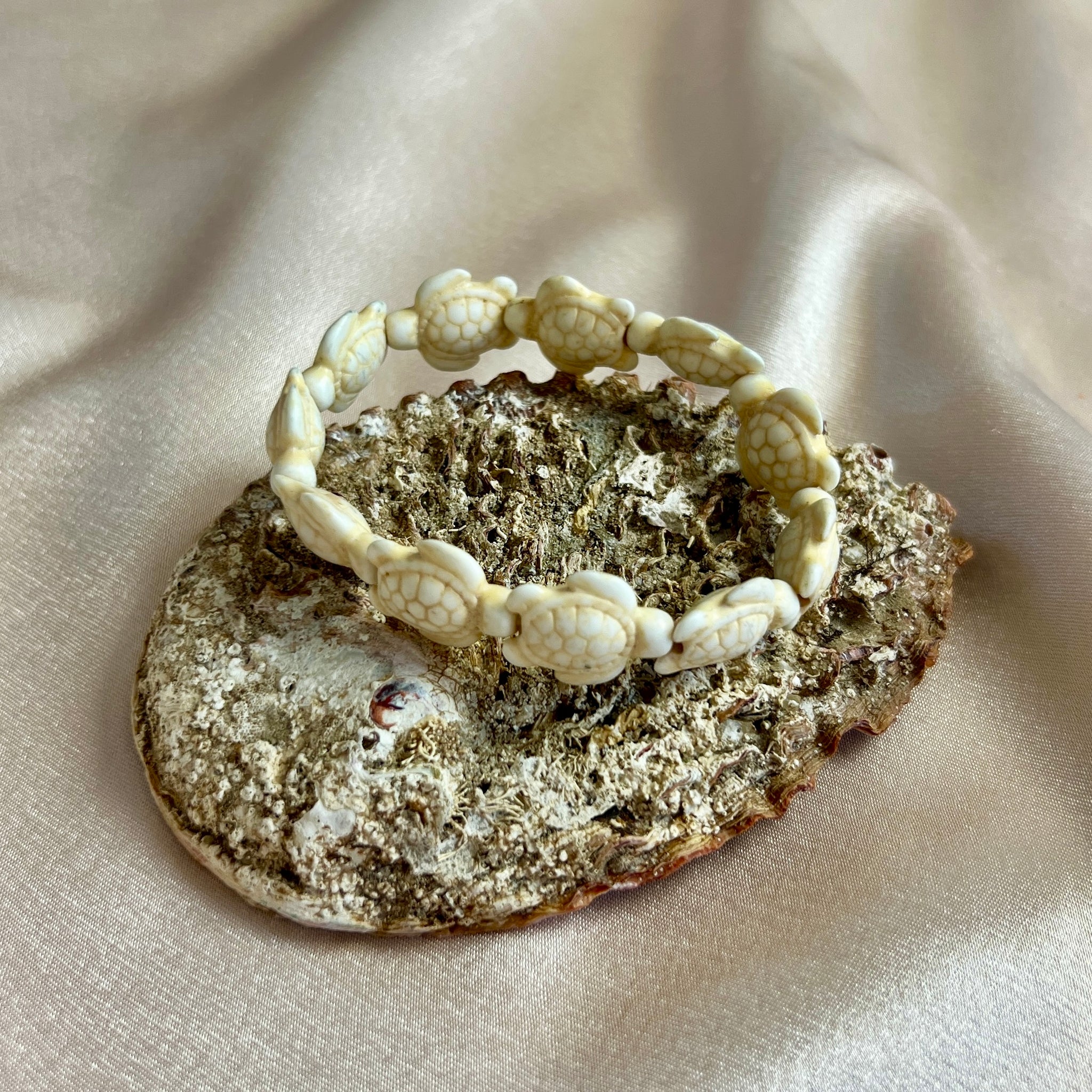 This bracelet features hand-carved bone turtle beads, each individually shaped with etched shell detailing and natural tonal variation that only comes with age.