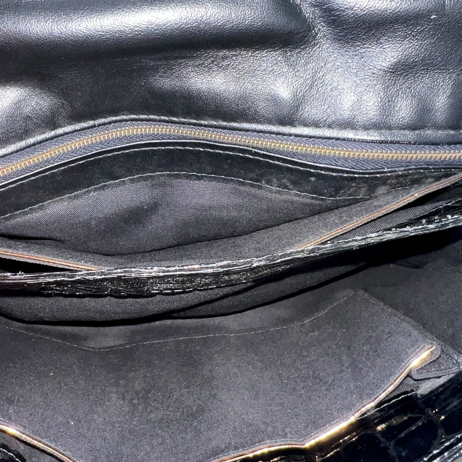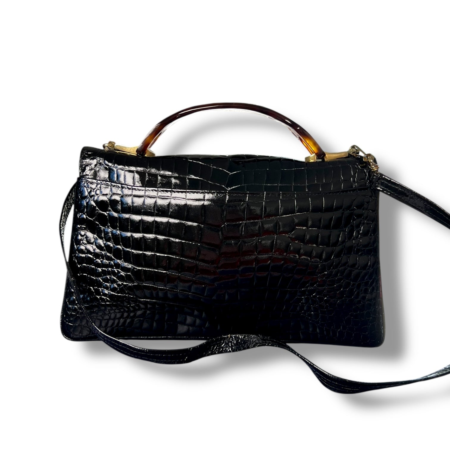 A timeless statement piece with serious vintage allure, this structured handbag is made from beautifully high-gloss croc-embossed leather, giving it a polished, sophisticated finish that feels both classic and bold. The sculptural lucite top handle and matching clasp add that unmistakable mid-century charm — a luxurious detail that sets this piece apart from the ordinary.