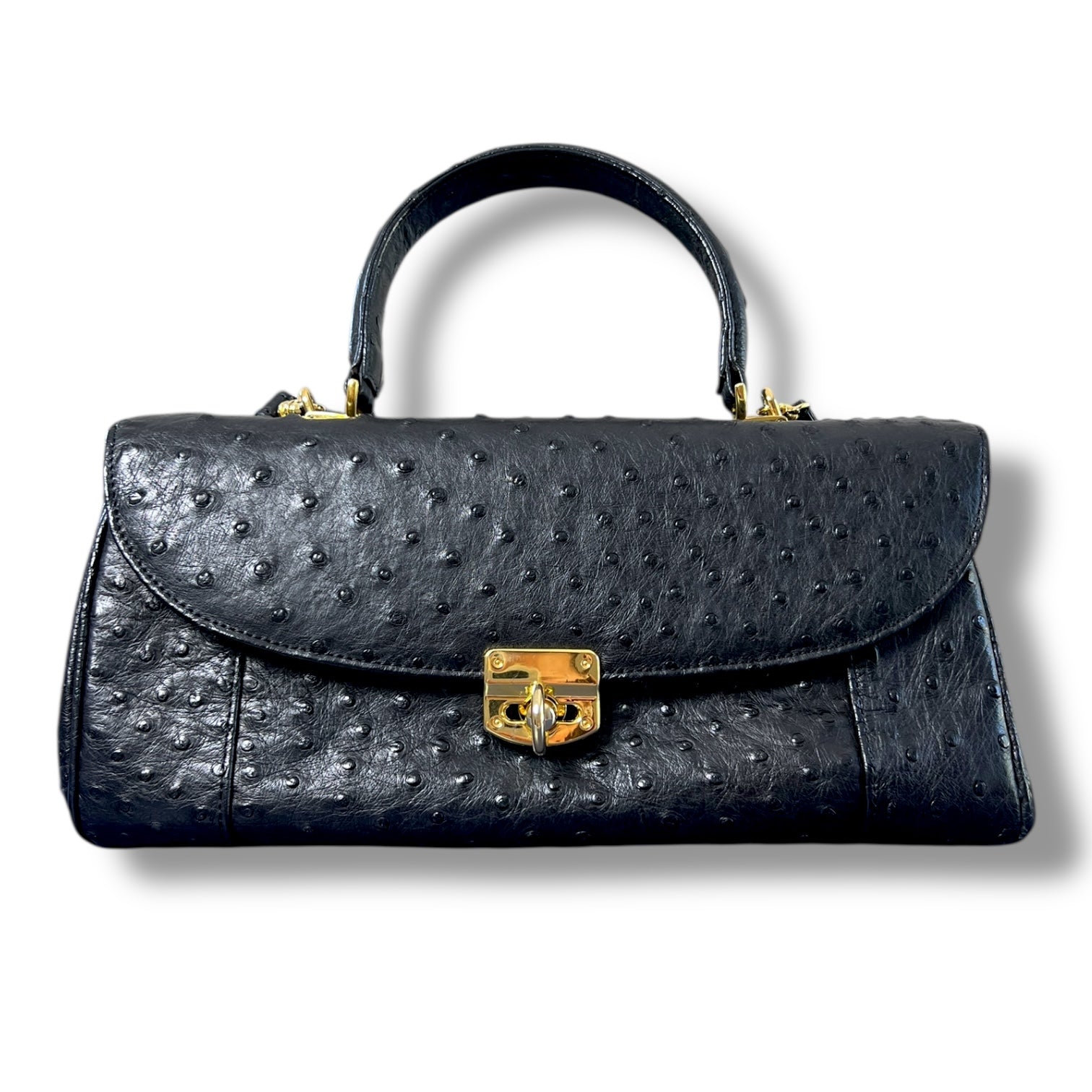 A striking vintage ostrich leather east–west bag in classic black, defined by its long, elegant silhouette and that unmistakable dotted quill texture that only genuine ostrich leather can offer. Sleek, structured, and beautifully proportioned, this is the kind of bag that feels intentional the moment you pick it up.