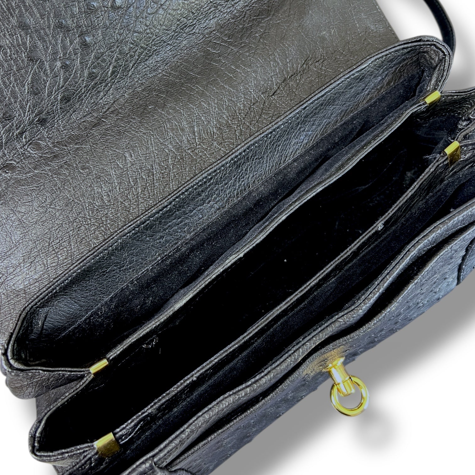 The ostrich leather has aged exceptionally well, with a soft sheen and supple feel while still holding its shape. The quill pattern is evenly distributed across the body, giving the bag depth and visual interest without overpowering its clean, architectural lines. Finished with polished gold-tone hardware and a secure front clasp, it strikes that perfect balance between understated luxury and quiet confidence.
