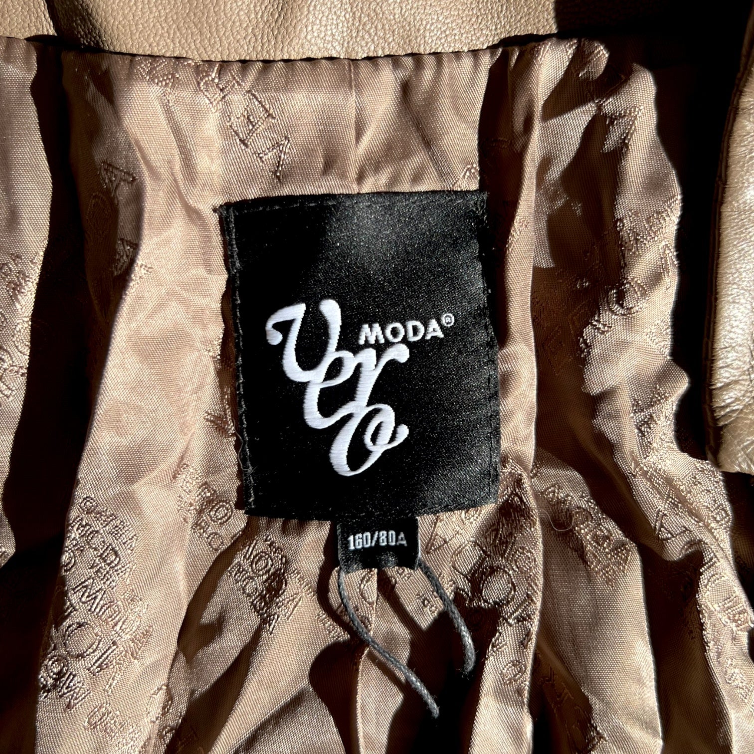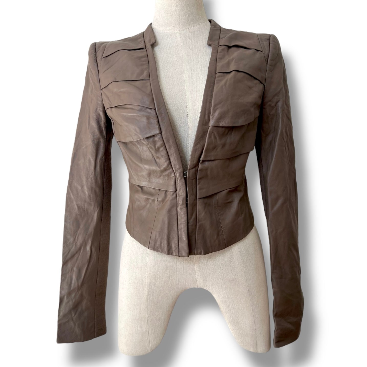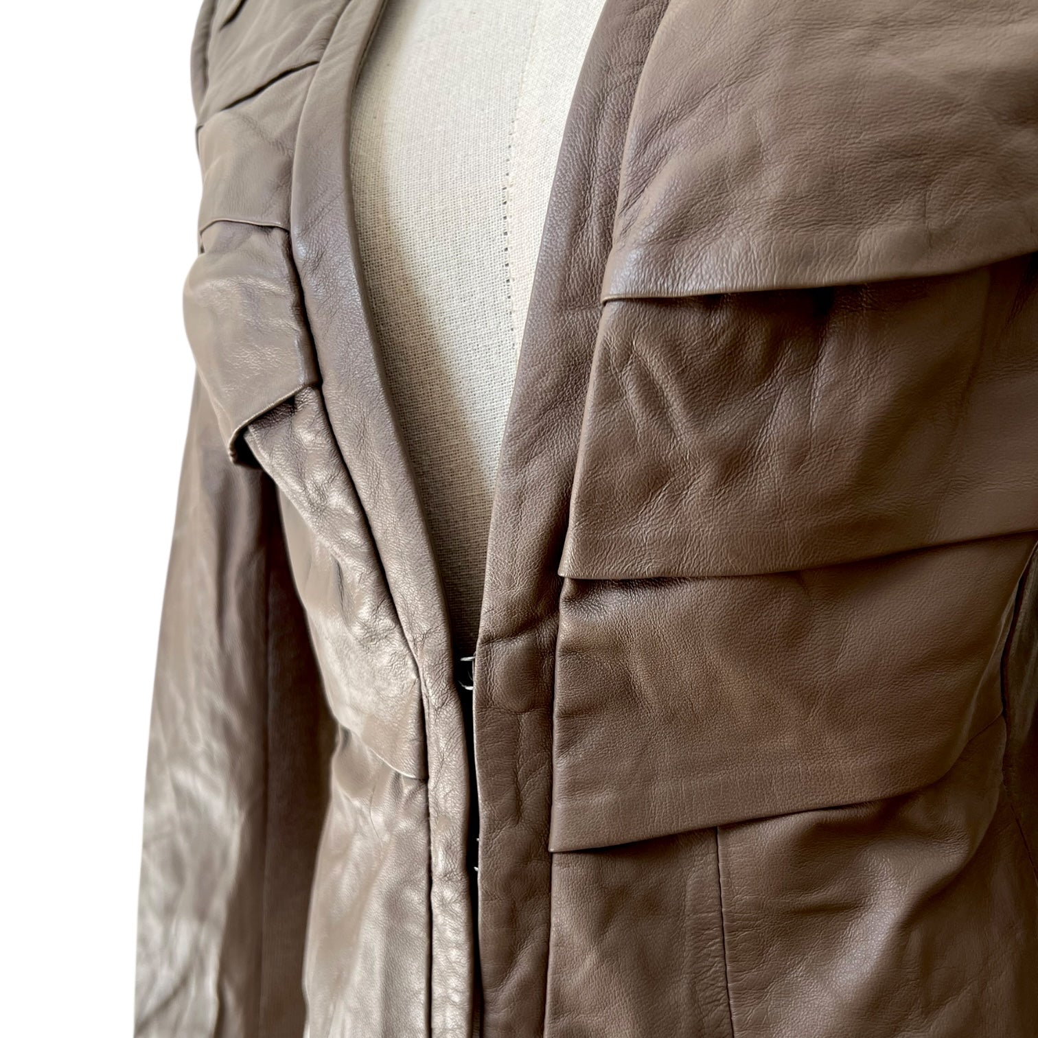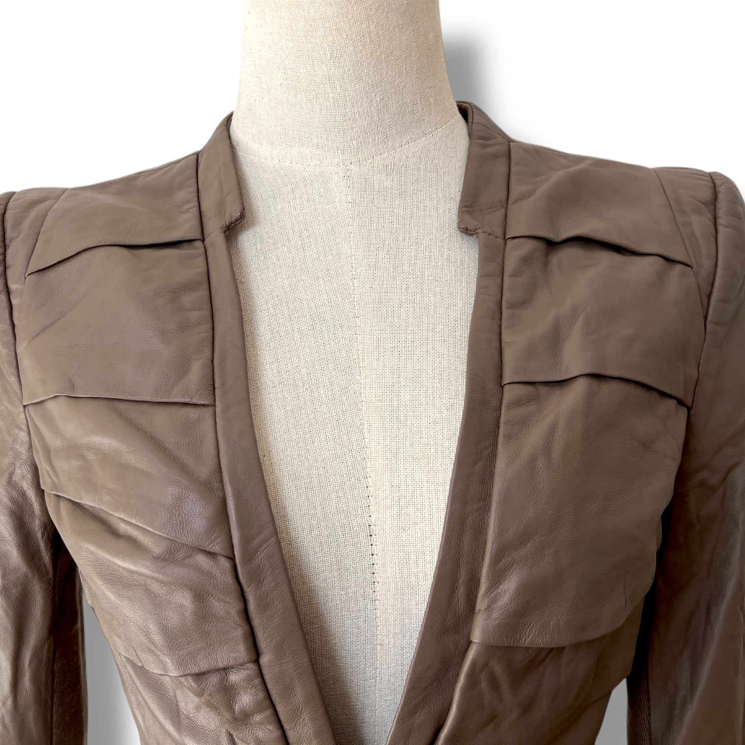 This beautifully structured vintage Vero Moda jacket is cut from buttery soft real leather in a rich chocolate brown. The bold silhouette features sharp shoulders and intricate pleating detail along the bust and bodice, creating a flattering, almost architectural fit.