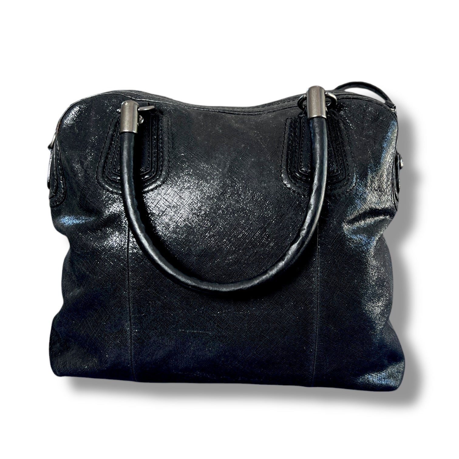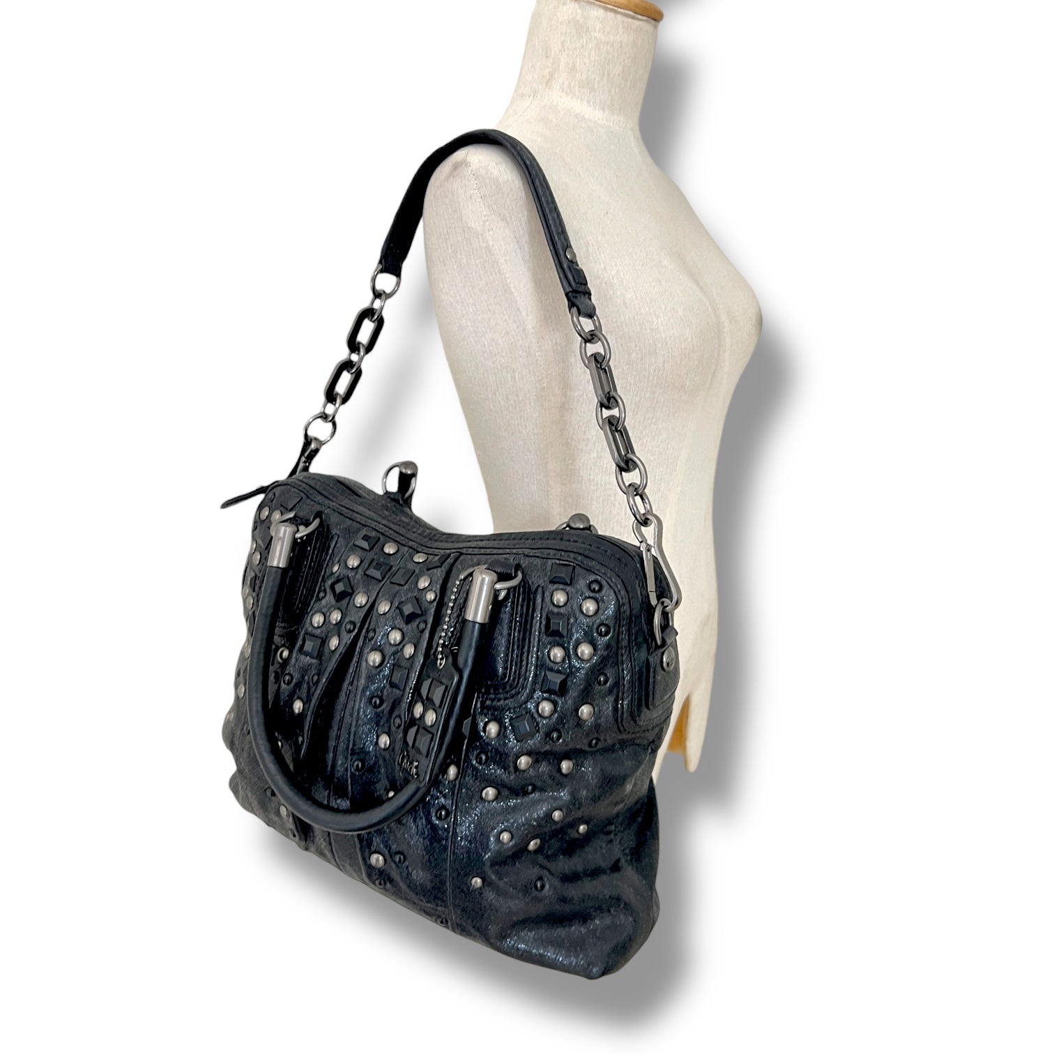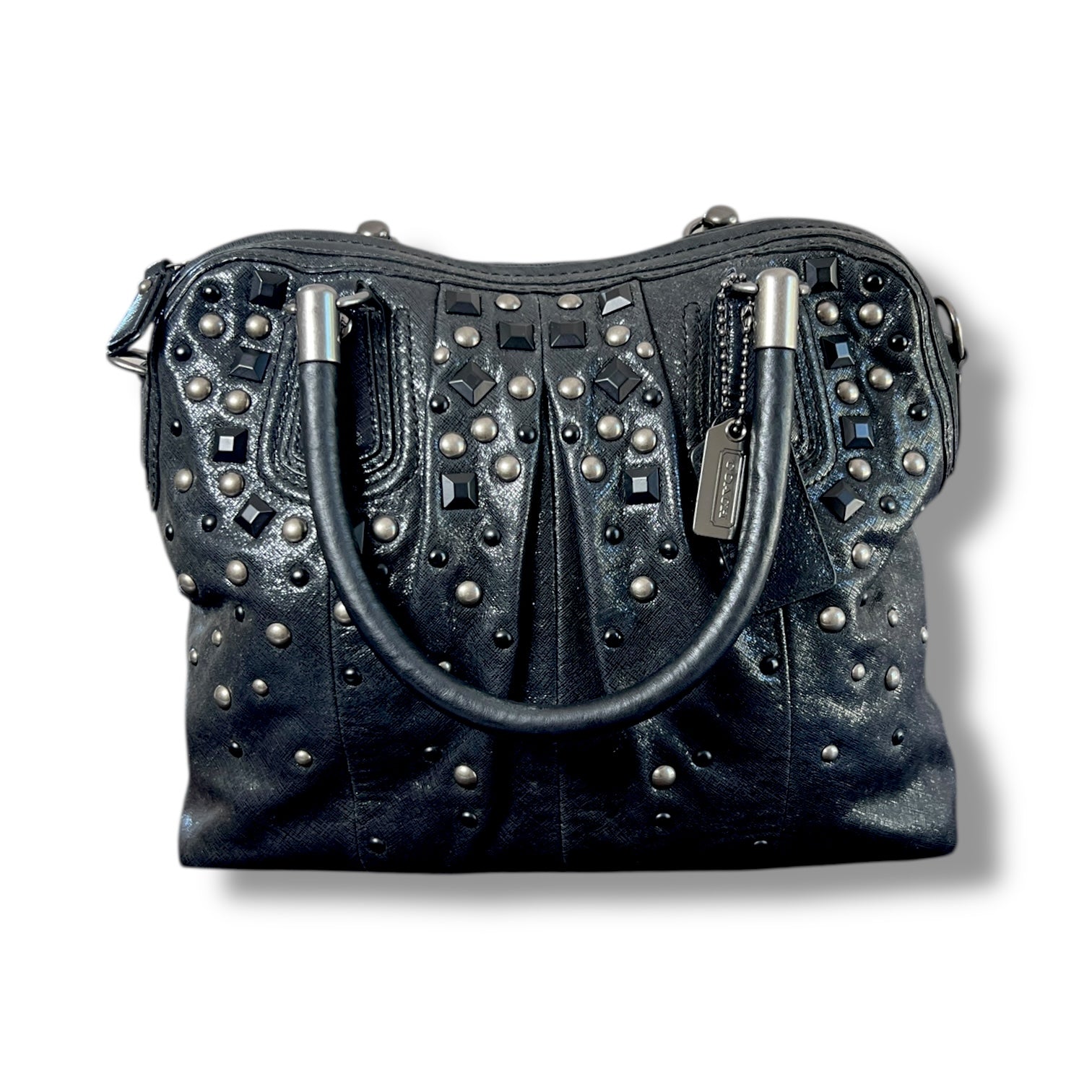 A more directional take on classic Coach, this bag sits firmly in that 2008β2012 era where the brand moved beyond its heritage basics into something a little more statement-driven. The mix of gunmetal studs, faceted black stones, and textured leather gives it that slightly rock-and-roll feel, while the silhouette keeps it grounded and wearable.