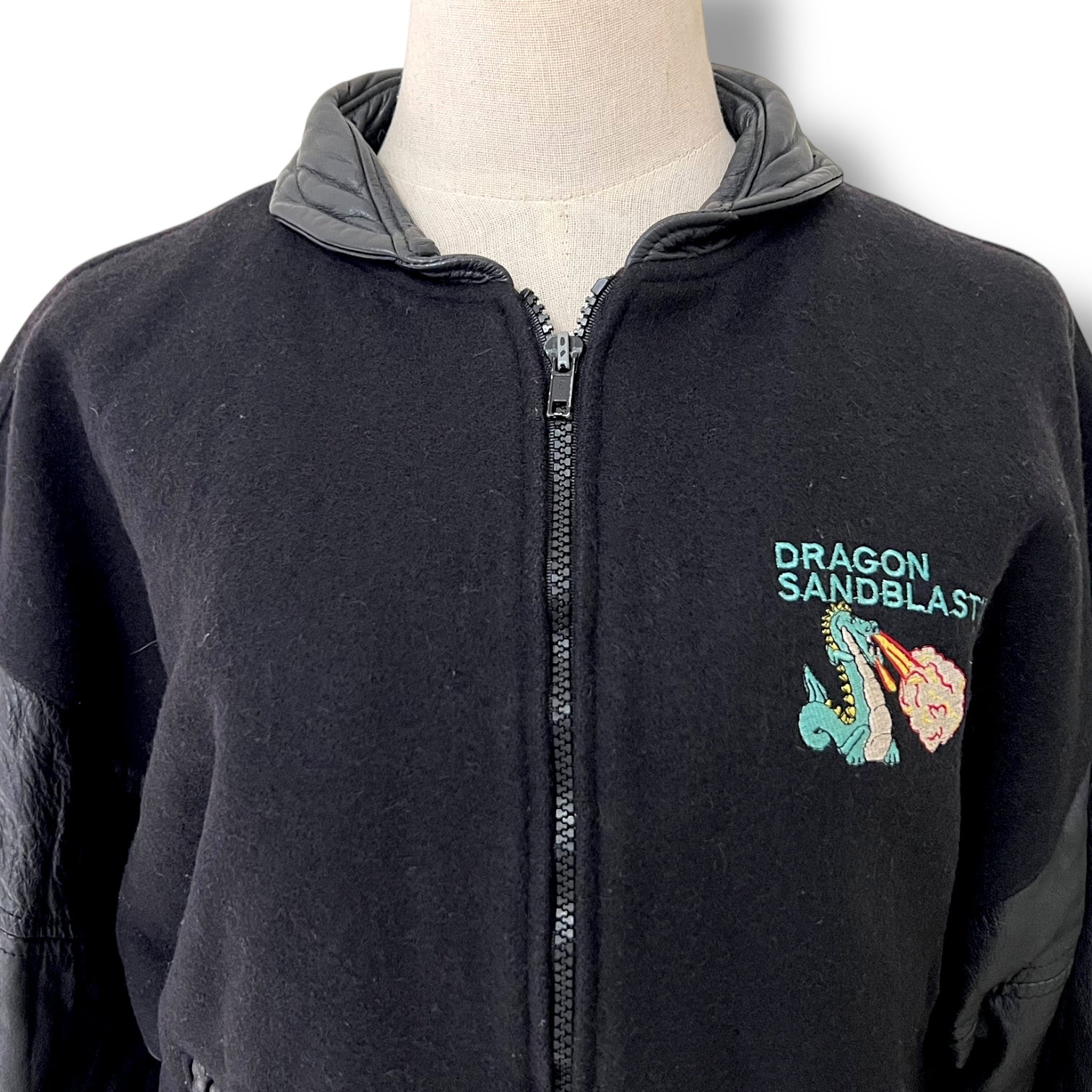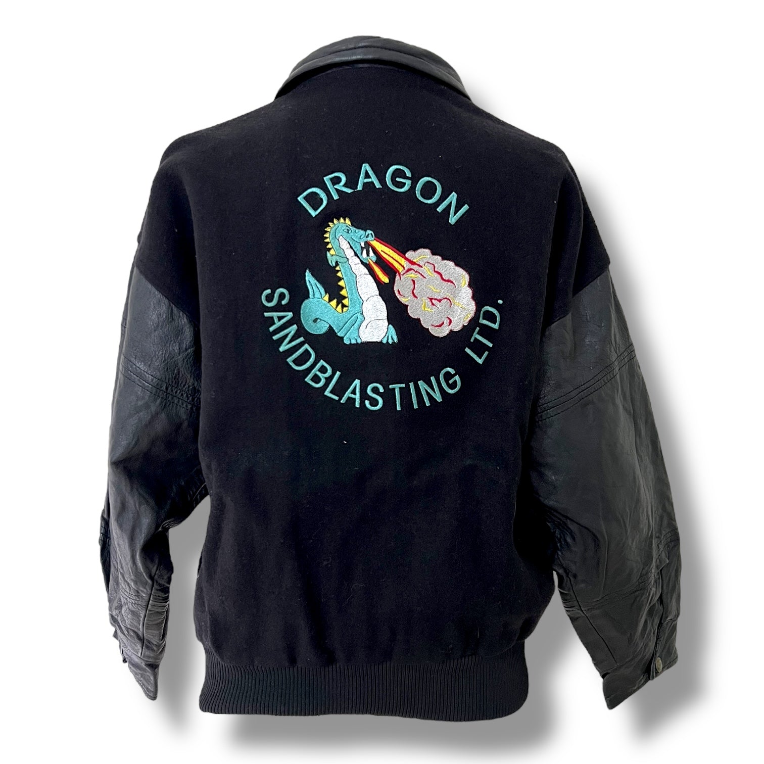 One-of-a-kind 80s/90s workwear gem with serious main character energy. This oversized bomber is fully lined and features quilted leather sleeves, ribbed hems, and bold embroidery on front, back, and sleeve — courtesy of the fire-breathing dragon mascot of Alberta-based Dragon Sandblasting Ltd.